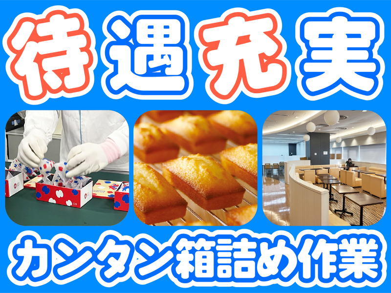 仕事内容 <アンリ・シャルパンティエ>や<シーキューブ>で人気の 「フィナンシェ」「マドレーヌ」などの個包装になった 焼き菓子・スイーツの箱詰めなどの軽作業のお仕事。 【お仕事の流れ】 step1.お菓子を箱に詰めていきます。 ↓ step2.お菓子を詰めた箱にラベルを貼ります。 ↓ step3.賞味期限や重さなど最終チェック ↓ 完了 黙々とできる単純作業です◎ ほとんどの方が未経験スタートです! <こんなお仕事経験のある方にオススメ!> ・ピッキング作業 ・食品製造業 ・食品工場での軽作業 ・工場での単発アルバイト ・短期バイトのオープニングスタッフ