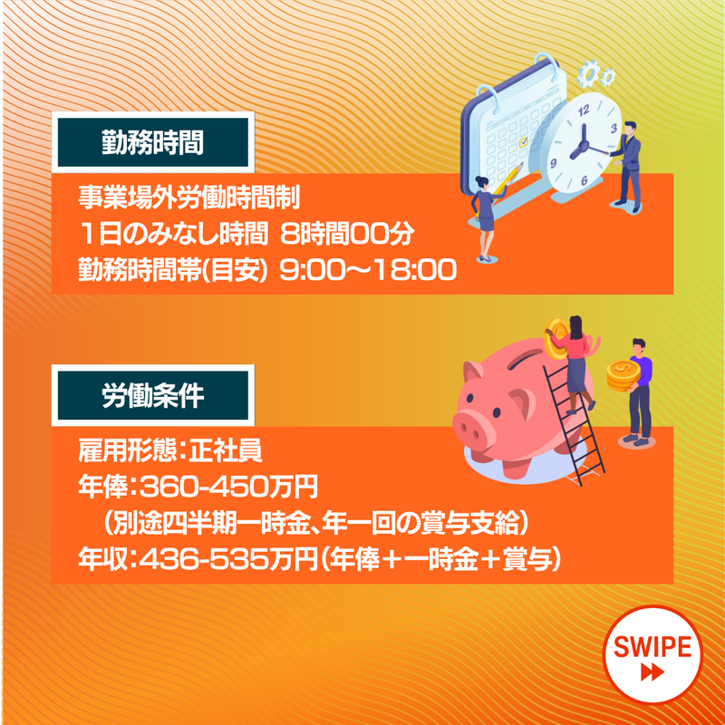 勤務時間詳細 実働時間:1日あたり8時間 平均勤務日数:1ヶ月あたり18日 〜 20日
