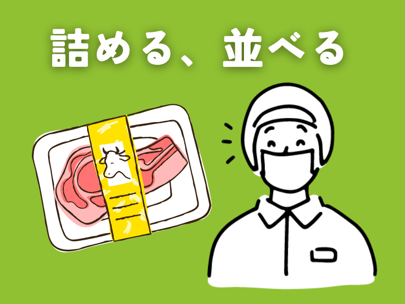 仕事内容 スーパーマーケット内での精肉販売をお願いします。 ・パック、値付け ・品出し ・精肉加工 ・衛生管理(清掃)