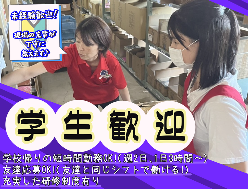 仕事内容 ✨✨✨✨✨✨✨✨✨✨✨✨ 2025年12月 新センターOPEN ✨✨✨✨✨✨✨✨✨✨✨✨ ✅髪色&髪型自由でお洒落OK! ✅ライフスタイルに合わせて働く ✅9:00〜18:00のフルタイム勤務 \ 難しくない軽作業 / < 商品の梱包 > < 仕分け作業 > < ピッキング > < 在庫数管理 > など ※ティッシュなどの見慣れた日用品 軽い→力仕事なし→身体に負担が少ない♪ ハンディ端末をピッと読み込んだり 作業の効率化をはかるシステムが きちんとあるのでお任せするのは シンプルは業務のみ♪ 教育体制もバツグンで安心です◎ <<オープニングメンバー大量募集>> ★新センターOPEN前から 研修は実施中!即日OK(同条件) ★同期入社がたくさんで心強い! ★未経験スタートの方がほとんど! ★希望は100%シフトに反映可能! (旅行・家族行事・趣味などが優先◎)
