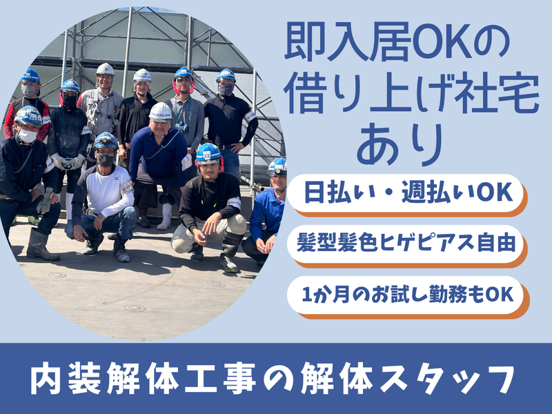 仕事内容 ✨新着求人✨ ====当社のアピールポイント==== ✅即入居OKの借り上げ社宅を完備しています! ⇒単身者用、カップル用、ファミリー用 など敷金・礼金など不要で入居可能! しかも… 家具家電付き&光熱費は当社負担! 都内に格安で住めます♪ ✅勤続1年後20万円支給します!(規定有) ✅現場仕事が初めての方も大歓迎です! ⇒学歴・経験・資格など一切不問! 大切なのは、「意欲」や「やる気」です! ✅日払い・週払いもOK♪(規定有) ✅髪型・髪色・ピアス・ヒゲ自由♪ ⭐お仕事内容について⭐ あらゆる建物を対象とした 内装解体工事をお任せします。 内装解体の工事は、 特にテナントなどの賃貸物件で 多く行ないます。 退去時、元の状態へ戻すことを 目的に、内装部分のみを解体します。 ⭐新生活応援!借り上げ社宅あり⭐ 未経験の方や無資格の方も応援!! 引越時の敷金・礼金は会社負担 入居後の光熱費も会社が負担します! 社員寮ではなく、賃貸物件の1部屋なので 同じマンションに先輩がいて、、、 なんて事もありません! プライベートもしっかり確保できます! ✨株式会社ケイ・エス・ケイについて✨ おかげさまで多数のご依頼に恵まれ、 業績も好調を維持しております。 そこで、今後さらに事業を拡大すべく、 スタッフの求人を行なっています。 入社後はそれぞれの現場に携わって 頂きます。 飲み会やBBQ、忘年会といった 社内行事を通して、普段から親睦を 深めています。新しい仲間として 弊社に加わって下さる事を、 スタッフ一同心より楽しみにしています!
