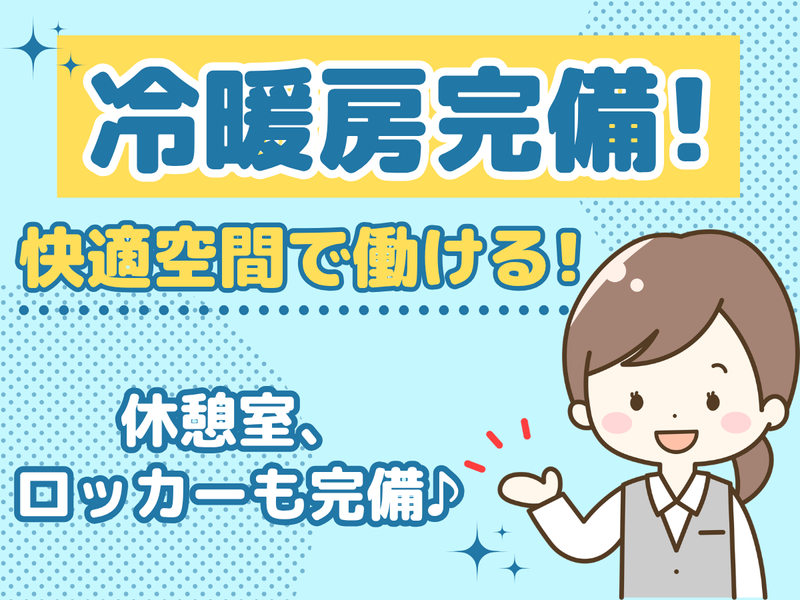 職場環境 <派遣先の雰囲気> ・休憩室、ロッカー完備◎ ・冷暖房完備なので寒い冬でも安心! ・家庭と両立しながら働くスタッフ多数活躍中! ・自動販売機、喫煙所もあるので快適! 喫煙所:喫煙所あり(屋外)