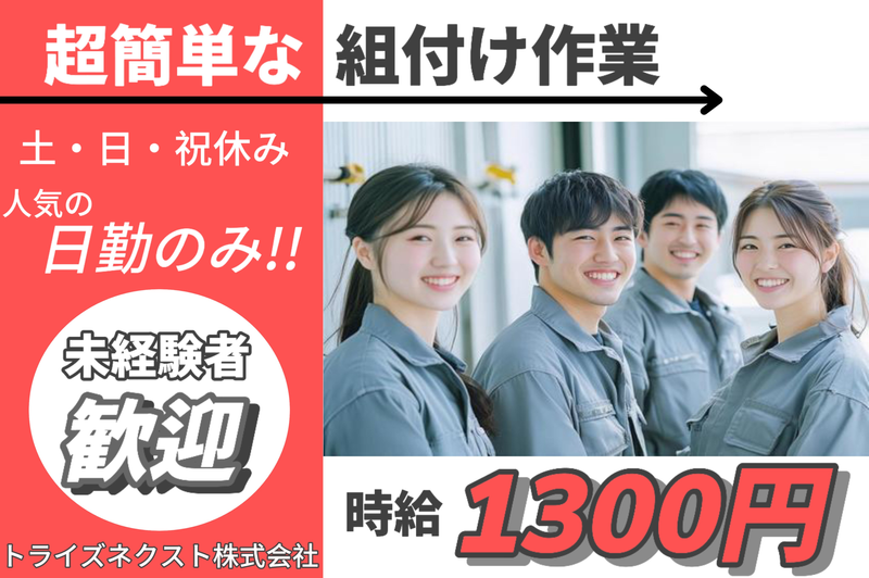 ■仕事内容 ★産業用ロボットの製造★ ⓵ロボットアームに工具を使用しての簡単な組付け作業 ⓶完成品の動作作業(前・後検査準備) ⓷その他、材料供給や塗装・出荷作業 世界中で使用されているロボットの生産に関わっていただきます! ※丁寧に教育してもらえますので、未経験者も是非ご応募下さい(*'▽') ■仕事の特徴 車通勤OK バイク通勤OK 友達と応募OK フルタイム歓迎 長期歓迎 平日のみOK 学歴不問 未経験・初心者OK ブランクOK 経験者・有資格者歓迎