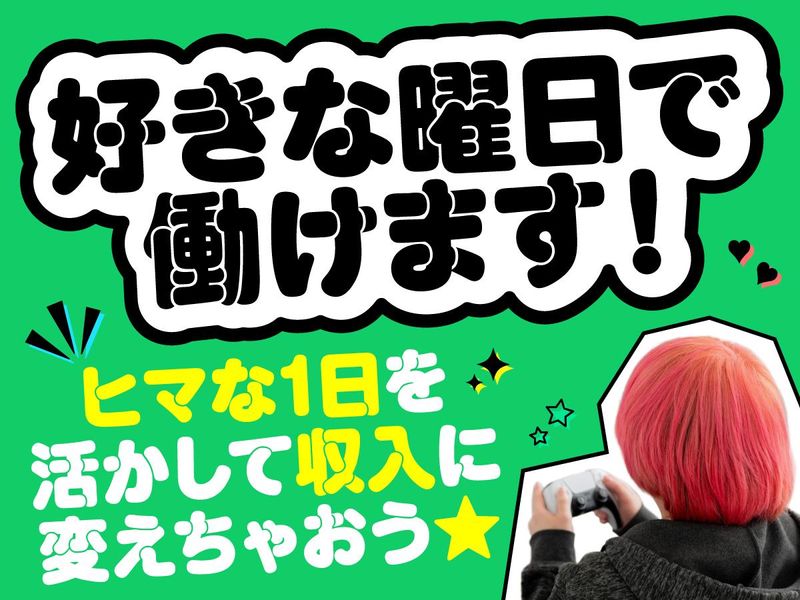 仕事内容 ━━━━━━━━━━━━ < 注目のレアバイト > 今の収入にちょっとプラス♪ 日勤でちょうどいい副業がしたい! そんな方にピッタリのお仕事 ━━━━━━━━━━━━ \\ゲームを仕事にするチャンス// 趣味のゲームをしてお金がもらえる! でも高難易度でノーミスクリアみたいな テクが必要というわけではありません。 大事なのは色んな視点で見ること♪ \\登録制バイトって何?// と思っている方、ラッキーかも! 好きな日を選んで申請する 登録制バイトは、 まだ当社での稼働は少なく、 応募しやすい今が狙い目。 登録自体もシンプルなので、 お仕事スタートまでスムーズ! 【仕事内容】 発売前の携帯アプリや 家庭用ゲーム等テストプレイの仕事! チェックリストを元に、 一つずつ不具合を探していき、 バグの可能性を見つけたら報告書を作成! ~例えばこんなバグを探します~ ・画像にズレがある ・レアアイテムのドロップがおかしい ・セリフの文字に間違いがある など //////////////// <登録制バイトについて> アプリで働きたい日を選んで 申請するだけでOK! 自分の都合優先で決められるので、 テストや旅行など、 予定を変更する必要もありません♪ ▼働き方として… 〇月1日だけの勤務OK 〇平日のみもOK 〇卒業までの1ヶ月だけなどの短期もOK ▼登録のステップ [1]WEBにてご応募 [2]受信メールに沿って面接を受ける ⇒面接はAI面接で実施するので、 自分の好きなタイミングで受けられる☆ 採用が決まったら、 専用のアプリから申請! ▼お仕事が始まるまでの流れ [1]働きたい日時をアプリから選ぶ [2]応募 [3]マッチングしたら勤務先へ出勤! 「この日に働きたい!」 という希望が叶うのが登録制バイトの特徴! 働きたい曜日とお仕事のタイミングが マッチングできれば、すぐに勤務OK! //////////////// <服装・髪型・髪色自由> 金髪・インナーカラー・メッシュもOK! 個性を大事にした職場だから、 居心地の良さも十分! お好きな格好で、家でゲームを する感覚で仕事ができる! <話題の"AI面接"始めました!> メールやSMSに届く内容を確認し、 好きなタイミングで面接ができちゃう☆ 面接後採用が出れば、翌日からデビュー! ////////////////