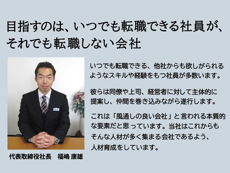選考プロセス 1)WEBよりご応募 2~3日以内に、電話orメールにて 連絡します。 ↓ 2)会社見学・面談 当社の事業や仕事内容、職場環境、 社員の雰囲気など見ていただき マッチングをご判断ください。 面談時はご自身の実績をご提示ください。 ↓ 3)適性検査(オンライン) ご自宅にて受検いただけます。 ↓ 4)面接 書面での履歴書、職務経歴書を ご持参・提出ください。 入社時期は、ご希望に沿います。 ↓ 5)採用内定