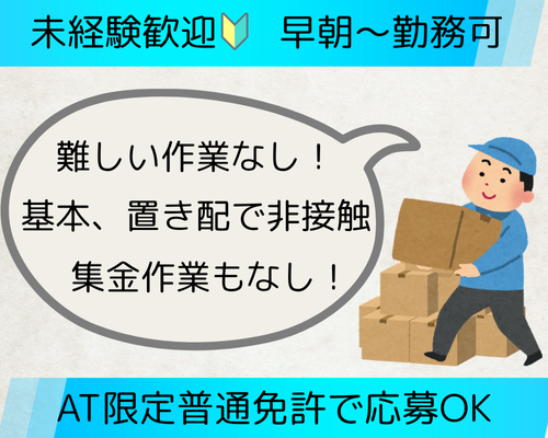 仕事内容 \ここがオススメ/ ・体力的負担少なめ◎ ・未経験OK!難しい作業なし! ・普通自動車免許があればOK! ・車両レンタルあり!車両持ち込みもOK! ・日額想定15,000円 ・完全出来高制!やった分だけ稼げます! ・自由な働き方が可能! ・20代~50代活躍! 【仕事の内容】 フレスタ会員様へ食品・日用品を配送するお仕事です。 (1)配送ルートの確認と、配送物(注文の食品・日用品)の確認 (2)配送物を軽バンに積み込む (3)フレスタ会員様の個人宅へ配送スタート (4)全て配達できたら事業所に戻り、帰宅 <配送件数目安> 1往復:25~35件 2往復:45~70件 ・難しい作業はありません!荷物を車に積んで配達するだけ♪ ・荷物はそんなに重くないです。重いものは台車を使えます◎ ・会員登録している個人宅に届けるのでルートも決まっていて安心!企業対応ではないので緊張もしません♪ ・荷物は「置き配」でOK!特にお客様との接触、集金はありません◎ ・車両レンタルあり(軽バン「ダイハツ ハイゼット パネルバン」) 【働き方】 ■業務委託契約(雇用契約ではありません) ※労働基準法上の適用(社会保険・雇用保険・労災保険、残業代、有給休暇など)はありません。 ※報酬は出来高制(成功報酬)です。 ・日額想定15,000円/8時間稼働想定 (月30万~50万稼ぐ方もいます!) ・早朝からの稼働もOK!(7時~や8時~もOK!早い方は6時~稼働している方もいます!) ・配送が終わり次第終了!遅くても18時には終われます◎(16時に終わる方もいます) 未経験でも難しくない作業で、経験も必要ないので明日からでも働き始められます! 生活リズムや収入面、他のお仕事との兼ね合いで一定柔軟に対応できますので、まずはご相談ください! ★まずはご面談・ご見学に来ませんか? 事業所の自宅からの距離や雰囲気、実際の業務の様子を見てから決めたいという方も多いです。 ぜひお気軽にご見学やご相談をお申し付けください♪ 本募集は個人(個人事業主・フリーランス)の方を対象としております。法人様からのご応募は対象外とさせていただきますので何卒ご了承ください。