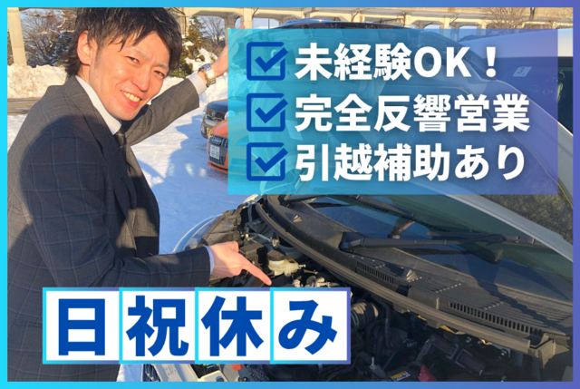仕事内容 〈車の買取スタッフとして、一緒に楽しく働きましょう!〉 ・未経験・専門知識がなくても正社員としてチャレンジできます!! ・20代・30代の方が活躍しやすい職場です! ・飛び込み営業、テレアポは一切なし(完全反響営業) ・様々な車の知識が身に付きます! 〈仕事の流れ〉 HPや広告を見た、売却を検討されるお客様からお問い合わせが入る ↓ お客様へのお宅に訪問 ↓ お客様の自動車を査定 ↓ 商談(契約) 出張査定件数は月に20件〜40件程度です。 〈入社後の流れ〉 3週間程度の研修後、先輩との同行営業へ!! 現場に出てからも研修時同様、随時先輩がフォローいたします。 良い意味で上下関係が厳しくない職場です。気さくで優しい人ばかりなので、入社後すぐに馴染めると思います♪ 仕事面では、頼れる先輩としてあなたの成長をしっかりサポートしてくれます! ※コロナウイルスの影響で半導体の流通が減り、新車が流通しなくなって中古車市場が盛り上がっています! 【研修内容の詳細】 STEP1. 基礎研修 「車の知識ゼロ」からスタートできる ・査定の基準 ・査定書の書き方 ・中古車市場の基礎知識 ・法律知識(自動車関連法規・消費者契約法など) ↓ STEP2. 実務研修 現場での動きを“体で覚える”期間 ・実車を使った査定練習 ・契約書の作成 ・お客様への説明ロールプレイ ↓ STEP3. 専門研修 どんな車でも査定できるプロへ ・車種別の査定ポイント ・事故車・水没車など特殊ケースの判断 ・最新技術の知識習得(EV・ハイブリッド・自動運転など) どんな車も査定がつけられるようになれるようサポートします! 【休日休暇】 <休日> 月曜定休、第2日曜、祝日 他指定日、4週6休 【2026年4月より週休2日制に変わります】 <休暇> 年末年始(6日間)・お盆(3日間)・有給休暇、リフレッシュ休暇 【待遇・福利厚生】 ・社会保険完備、昇給年1回、時間外手当 ・賞与年2回 ・交通費規定支給(月2万円迄) ・車通勤OK(無料駐車場完備) ・寮完備(雁来インター店のみ) ・社内割引あり ・営業車・携帯貸与 ・引越補助10万円支給(入社前に転居が伴う場合のみ) <各種手当あり> ・家族手当 (配偶者/5000円、子ども1人につき2000円) ・業績手当 (会社の売上目標に対する達成率に応じて支給) <社内イベントあり> ビアガーデンや焼肉パーティー、 企画ツアーなど楽しい交流イベントあり