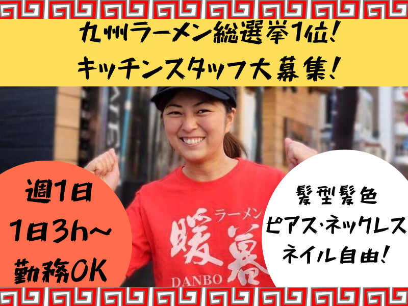 仕事内容 \人気ラーメン店で調理スタッフ大募集!/ \九州ラーメン総選挙1位の絶品賄いが無料/ ✨春から新大学生の方も大歓迎✨ ラーメン暖暮はバイトデビューにもオススメ♪ 授業やサークル優先で働けるから 履修登録前やサークル入部前の応募もOK 未経験からプロの技術を学べるチャンス◎ 1日3h~勤務OKだからプライベートと両立も◎ 今後も続々出店を予定しております! <<お仕事内容>> ✅仕込み ✅調理 ✅ラーメンの盛り付け ✅洗い場 など、調理業務全般をお願いします。 最初は簡単な作業からスタートするので、 未経験の方も安心です! スタッフ同士の仲も良く、 分からないことは気軽に質問できる環境です♪ <<ここがPOINT!>> ✨髪型・髪色・ピアス・ネックレス・ネイル自由! オシャレしながら働けます◎ ✨九州ラーメン総選挙1位の絶品まかない付き! ✨正社員登用制度あり!アルバイトからキャリアアップも可能 ✨交通費は全額支給! ✨日本語能力検定N1以上をお持ちの方も活躍中! <<ラーメン暖暮について>> 私たちにとって、ラーメンはグルメなごちそうではなく、 いそがしい日常のなかでホッと 一息つかせてくれるソウルフードでした。 その思いは福岡県筑紫野市に最初の「ラーメン暖暮」を 立ち上げた平成12年から今日まで少しも変わっていません。 私たちの「暖暮」という屋号は、そんな 「皆さまの日常の暮らしにもホッとできる暖かな一杯を。」 というささやかな思いをこめて名づけました。 <<公式サイト>> http://www.danbo.jp/