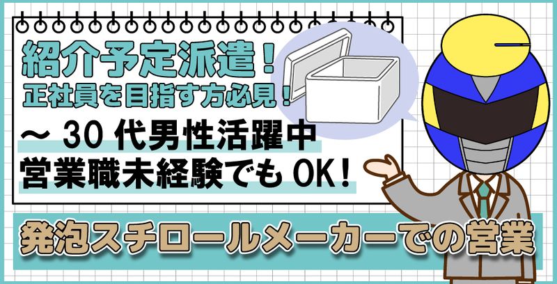 仕事の内容 【営業職未経験者の方活躍中!】 3ヶ月の紹介予定派遣! →3ヶ月後、正社員登用を前提とした求人です! 正社員になりたい方必見! 【お仕事内容】 発泡スチロールを製造している企業での営業のお仕事です(^^)/ 新規/既存のお客様への打ち合わせや商品の提案など、営業全般のお仕事をお任せします(*^-^*) 派遣の期間は社内の様々な部署で経験を積んで頂きます。 (製造部門や開発部門等) 製品の事をしっかり学んでからの営業業務となります(^^) まずは職場見学と面接をさせて頂きます。 前向きに正社員を目指している方の募集をお待ちしております。 【紹介予定派遣】 本求人は「3ヶ月の紹介予定派遣」となります! 紹介予定派遣は特定の期間内は派遣社員として働き、 派遣期間が終了する際に双方の同意があれば正社員として再雇用する働き方です! 正社員を目指す方必見! 【ポイント】 ●紹介予定派遣! ⇒正社員を目指す方必見! ●営業職未経験者活躍中! ●人気の日勤・土日祝休み! ●長期休暇あり(年末年始・GW・夏季休暇) ●食堂スペース完備 ●制服貸与 ●無料駐車場完備 ●受動喫煙対策あり(屋外喫煙所設置) ★本求人にご興味をお持ちの方は、応募する!より必須項目記載の上、 お問合せ下さい。 (お電話でのお問合わせ先:0120-67-3244 ※平日9時00分~18時00分)
