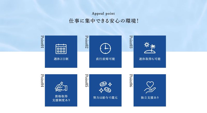 アピールポイント 【 待遇や給与についても相談可! 】 20以上の資格をもつ代表が、将来のために成長したい社員の味方になります! 待遇や給与についてもいつでも相談ください! より良い職場環境について話し合い、従業員の満足度を上げていきたいと考えてます! 【 独立支援制度も充実! 】 独立されたい場合は、下請けとして協力会社になるなど当社が全力でサポートが可能です! 資材の仕入れ先、協力会社、税理士の紹介などノウハウ含めできることは何でもお手伝いします。 ▶▷詳細は「応募先へ進む」をチェック!