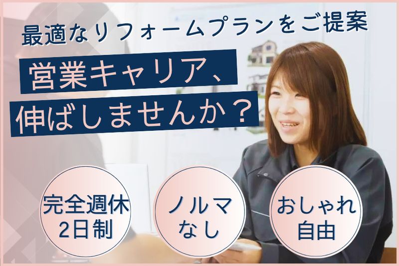 【アピールポイント】 ✨理想のお家をコーディネート✨ 住宅外観のリフォームプランナーを正社員募集! ■完全週休2日制 ■髪型髪色自由/ネイル・ピアスOK ■ノルマ/テレアポ/飛び込みなし 《営業経験2年以上(業界不問)必須》