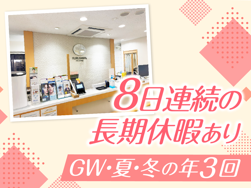 仕事内容 \定着率が高く、久しぶりの募集です/ ✨年間休日132日+完全週休2日制 ✨年3回“8連休”あり(GW・夏・冬) ✨残業ほぼなし(月3時間程度) プライベートと両立しながら 長く働ける環境です♪ 【仕事内容】 受付・医療事務・眼科検査の サポート業務をお任せします。 具体的には ・受付対応 ・会計業務 ・カルテ入力 ・簡単な眼科検査の補助 などを行います。 特別な資格や経験はなくても大丈夫です。 (経験者優遇) ■ お休みはたっぷり◎  ̄ ̄ ̄ ̄ ̄ ̄ ̄ ̄ ̄ ̄ ̄ 完全週休2日制+残業ほぼナシ! さらに、GW・夏・冬の年3回、 必ず8連休があります! ゆっくり帰省や海外旅行に いくこともできちゃいます♪ ■ 調布駅徒歩2分でアクセス抜群◎  ̄ ̄ ̄ ̄ ̄ ̄ ̄ ̄ ̄ ̄ ̄ ̄ ̄ ̄ ̄ ̄ 新宿駅から京王線で17分! 新宿、渋谷方面からも通勤しやすいです♪ ■ 古沢眼科について  ̄ ̄ ̄ ̄ ̄ ̄ ̄ ̄ ̄ ̄ 地域の方に長く親しまれている 開院29年の眼科クリニックです。 コンタクト診療から日帰り手術まで 幅広い診療を行っています。