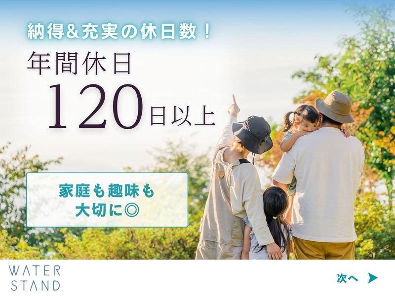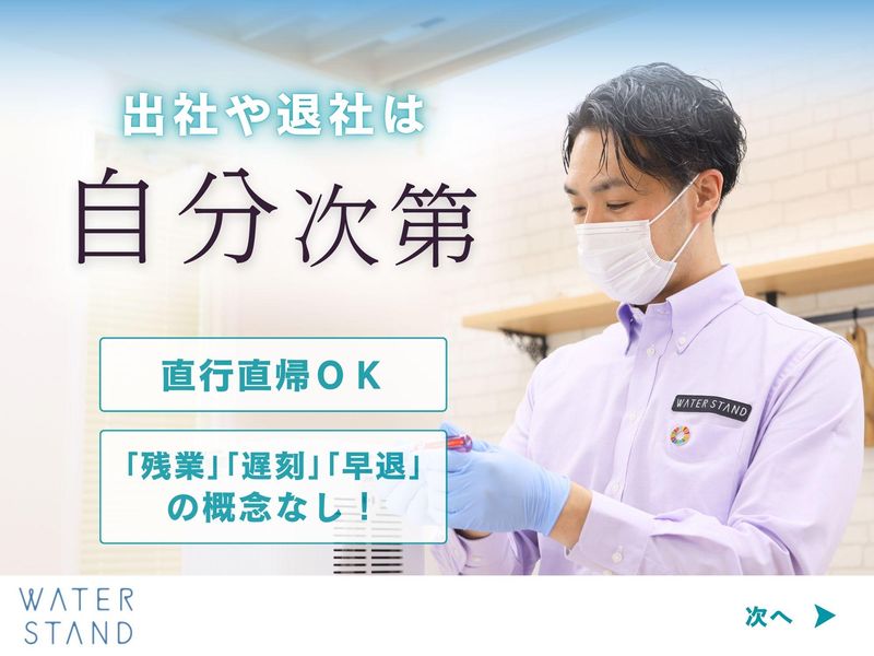 仕事内容 / 働き方の概念が変わる!? ストレスフリーで 自由な働き方を.・☆* \ . 業績好調!! 営業スタッフ増員募集♪ . ================= この求人のポイント♪ ================= ◆経験・スキル不問! <普通免許があればOK>です☆ ◆年間休日<120日以上!> ◆未経験も安心の<サポート体制完備♪> ◆<スーパーフレックス制>で 理想の働き方が実現♪ ◆ノルマはありません!! . . ================= 仕事内容はこちら! ================= . ✅サーバーメンテナンス  ̄ ̄ ̄ ̄ ̄ ̄ ̄ ̄ ̄ ̄ ̄ ̄ フィルター交換や作動チェックなど 既存のお客様先にて メンテナンスを行います! 1件40分ほどの時間が掛かるので お客様とのお話しを楽しみながら 作業をお願いします♪ 設置から修理まで、やり方は 研修でしっかりレクチャー! . ✅新規顧客対応  ̄ ̄ ̄ ̄ ̄ ̄ ̄ ̄ 電話やSNSからお問合せいただいた 新期のお客様先にて、 お客様の要望をヒアリングし 最適な機種のご案内を行います! . ✅設置・交換・撤去  ̄ ̄ ̄ ̄ ̄ ̄ ̄ ̄ ̄ ̄ ご契約されたお客様先にて ウォータースタンドの設置を行います! 設置方法や お手入れ方法のご説明などは 入社後にしっかり研修を行うので どなたもご安心くださいね♪ . 上記業務をお任せします! . もちろん、 社用車や制服 タブレットや携帯電話などの 業務に必要なものは貸与! . . ================= 安心の<サポート体制!> ================= ◆入社後、まずは座学研修で 商品知識や訪問マナーなどを 基礎から丁寧にレクチャーします! . ◆座学研修後は、OJT研修で 先輩に同行し実際の現場を 学んでいただきます! . ◆独り立ち後も 階層別の勉強会や研修を実施♪ . 更に・・ 週に一度、 上長との面談を設けています。 ◎実務上のトラブル解決方法 ◎アドバイス・フォロー などなど・・ 些細なことから 相談できる環境が整っています♪ 安心してご応募ください☆ . . ============== <直行直帰>可能! ============== ご自宅から直接 お客様先へ訪問をし、 そのまま直帰OK! 勤務時間や休日は 自分で決められるので 週休3日の働き方も◎ フレックスタイム制ならではの 働き方が実現可能です♪ あなたが「働きやすい!」と思える ワークライフを見つけていきましょう! . . ============== 1日のスケジュール例 ============== 9時 自宅から出発! メンテナンスで3件訪問 12時 ランチタイム♪ 13時 新規のお客様先へ! しっかりヒアリングし、 お客様に合った機種をご案内♪ 15時 設置作業で2件訪問 17時 自宅へ直帰♪お疲れ様でした! . あるスタッフの1日の例ですが 上記のような働き方が可能です♪ . . =============== ウォータースタンドについて =============== 当社は、 「 2030年までに日本の 使い捨てプラスチックボトルを 30億本減らします。 」 というミッションを掲げ マイボトルを携帯する 新しい文化を創り、 気候変動とプラスチックによる 環境問題改善に取り組んでいます! . 一般のお客様だけでなく 官公庁や公共施設、 企業などのお客様からも 幅広く支持いただいております♪ このような信頼のもと 事業は右肩上がりで成長中! . ☆SNSでも話題のウォータースタンド☆  ̄ ̄ ̄ ̄ ̄ ̄ ̄ ̄ ̄ ̄ ̄ ̄ ̄ ̄ ̄ ̄ ̄ ̄ . // あなたのご応募を お待ちしております! \\