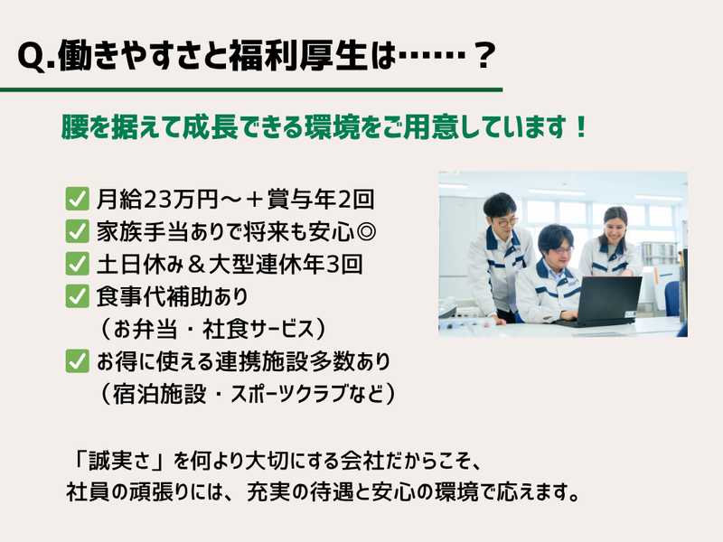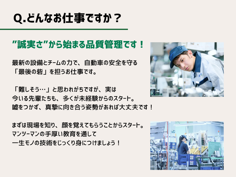 求めている人材 \未経験OK✨品質管理・保証/ ■要普通自動車運転免許 ■経験不問 ■新卒・既卒・第二新卒OK →25卒・24卒・23卒も ■20代若手が活躍中 【歓迎条件】 ■製造現場での何らかの実務経験 ■営業・販売職などでの対人業務経験 ■円滑なコミュニケーションを大切にできる方 ■モノづくりの現場を支えることにやりがいを感じる方 ■実力・経験に応じて正しく評価される職場で働きたい方 ■ステップアップ・成長しながら働きたい方 ■ハローワークでお仕事探ししている方 こんなワードでお探しの方も大歓迎  ̄ ̄ ̄ ̄V ̄ ̄ ̄ ̄ ̄ ̄ ̄ ̄ ̄ 製造/品質管理/品質保証 販売/接客/ ■ 採用担当からのメッセージ ┈┈┈┈┈┈┈┈┈┈┈┈┈┈┈┈•• 「未経験からプロになれるかな?」 という不安。 そのままで大丈夫です 。 私たちが何よりも大切にしているのは、 経歴ではなく、不具合やお客様に 「誠実に向き合えるか」というお人柄だからです。 入社後は先輩スタッフがマンツーマンで、 機械の名前から図面の読み方まで丁寧に教えます。 わからないことをわからないと言える、 風通しの良さには自信があります 。 自動車の安全を守る「最後の砦」として、 一生モノの技術を身につけてみませんか? 「車が好き」「地元で安定して働きたい」 というあなたの挑戦を、全力で応援します!