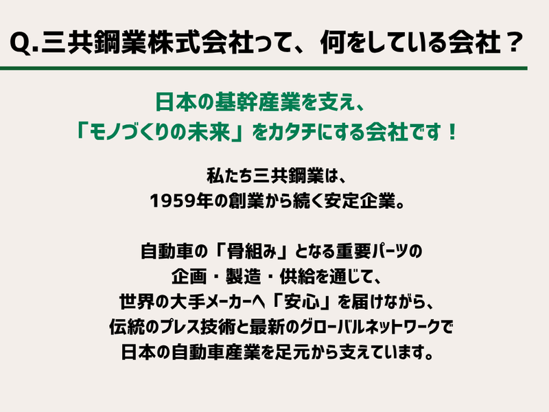 仕事内容 私たち三共鋼業株式会社は、 トヨタグループ主要企業(アイシン・トヨタ紡織など)の パートナーとして、自動車に欠かせない部品を作る会社 。 「自動車の部品なんて、難しそう……」 なんて思っていませんか? 実は、いま活躍している先輩たちも、 多くが知識ゼロからのスタート 。 平均年齢35.5歳、若手からベテランまで 「モノづくり好き」が集まっています! ■あなたにお任せする 「2つ」の重要ミッション✨ ┈┈┈┈┈┈┈┈┈┈┈┈┈┈┈┈•• 品質管理の仕事は、大きく分けて2つ。 「未然に防ぐ」ことと 「起きた後、二度と起こさない」ことです。 【1】良いものしか作れないライン作り(予防業務) 不具合が出てから直すのではなく、 最初から「良いものしか作れない」ような 製造ラインの仕組みづくりに関わります。 まさに、モノづくりの「根幹」を支える仕事です。 【2】問題解決のスペシャリスト(処置業務) 万が一不具合が起きた時は、原因を突き止め、 再発防止のための対策を練ります。 ・原因の調査や報告書の作成 ・改善活動や、節目となる会議の準備 「どうすればもっと良くなるか」を考え、 形にしていきます。 ▶「誠実さ」があればそれで合格点です! ┈┈┈┈┈┈┈┈┈┈┈┈┈┈┈┈┈┈┈•• 「製造業の知識? 図面の読み方? 難しそうです!」 …全然大丈夫です! 私たちが求めているのは、今のスキルではなく 「嘘をつかず、誠実に、真摯に向き合えること」。 ■三共鋼業流成長ステップ✨ ┈┈┈┈┈┈┈┈┈┈┈┈┈┈┈┈┈┈┈•• ① まずは「顔を覚える」ことから 入社後は先輩社員のすぐ横で実務を学びます。 まずは製造現場を巡回して 現場スタッフに顔を覚えてもらい、 誠実な対応を心がけることからスタートしましょう。 ② 基礎を支えるサポート業務 製品の不具合チェックや、 お客様からの問い合わせ対応の サポートからお任せします。 製品の不具合原因の調査や簡単な解析補助など、 少しずつ専門的な領域に触れていきます。 ③ 品質を守るプロフェッショナルへ 品質データをまとめるための 書類作成や管理、 製造工程のチェック業務などを通じて、 業務全般を牽引できる存在を目指してください。 教育体制が整っているので、 着実にステップアップできます。 ■ メリハリを持って、長く働く。 ┈┈┈┈┈┈┈┈┈┈┈┈┈┈┈┈┈┈┈•• 品質管理は「最後の砦」だからこそ、 責任もあります。 でも緊急対応は年に1回あるかないか程度と、 メリハリを持って働けるのが自慢です。 土日休み 、大型連休(GW・夏季・年末年始) もしっかり10日程度あります。 安定した基盤の上で 、 じっくりと腰を据えて自分の未来を築いていきませんか? ■私たちの雰囲気について ┈┈┈┈┈┈┈┈┈┈┈┈┈┈┈┈•• 会社のサイトをご覧いただくと、 弊社全体の雰囲気を感じていただけると思います! ▼Instagram✨▼ https://www.instagram.com/sankyokogyo/ ▼YouTube✨▼ https://www.youtube.com/@SANKYOKOGYO (社内の活気や、大切にしている価値観が伝わるかと思います!)