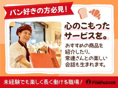 仕事内容 おいしい焼きたてパンをお客様に笑顔でお届けする仕事。就活などに役立つ接客マナーも身に付きます。 商品棚にパンを並べたり、補充をしたり、レジでの接客対応や袋詰め、売り場でお客様へお声掛けをしたり、店内の清掃など、焼き立てパンの販売と接客をお願いします。店舗には工房が併設されているので、焼き立てパンのいい香りの中で働けます。 未経験者大歓迎!幅広い層のメンバーが活躍中です。 「お客様に喜んでいただけること」を一番大切にしているため、経験がなくても素直にアドバイスが聞ける方や接客に興味がある方、新しいことにチャレンジしてみたい方など、前向きに頑張れる方なら大丈夫!先輩たちがしっかりサポートします。 長い歴史と多くの店舗を持つ私たちだからこそ、充実した教育制度があります。安心して始められますよ。 「あいさつ」のような基本から、陳列時のコツなどの細かい作業のアドバイスまで、あなたに合わせてしっかりフォローします。わからないことは先輩にすぐ聞ける風通しの良い社風も私たちの自慢です。 全国で店舗を展開する業界屈指の企業だから、安心して長く働ける待遇や制度もしっかり整っています。 自慢の焼きたてパンがお得に買える社員割引をはじめ、おしゃれな制服貸与、社員登用制度など充実の福利厚生が魅力。もちろんシフトは相談OK◎働きやすさは抜群です! ポンパドウルの創業は1969年。フランス仕込みの焼きたてパンは、全国のお客様に愛されています。 1969年に横浜・元町に1号店を開店して以来、全国に多数の店舗を展開するまで成長した私たち。たくさんのお客様からの「おいしい」や「ありがとう」の声が、私たちのやりがいです。