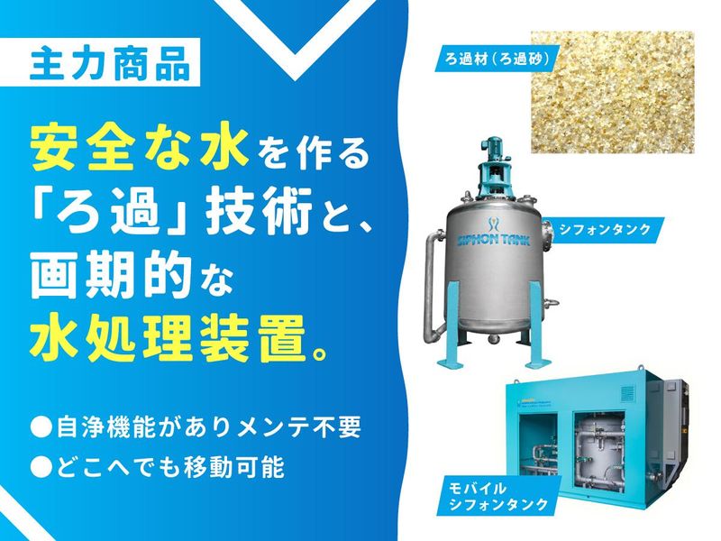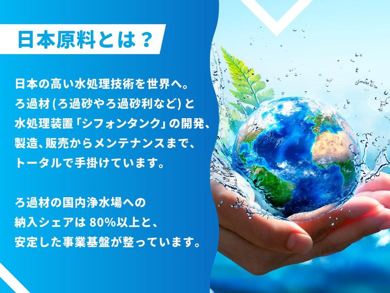 仕事内容 私たち日本原料の営業は、単なる“モノ売り”ではありません。 ろ過材や水処理装置を通じて、「水インフラの課題をどう解決するか?」を提案する、《技術提案営業/課題解決型営業》です。 ‥‥‥‥‥‥‥‥‥‥‥‥‥‥‥‥‥‥‥‥ ≫ 主なお客様 ・全国の水道局や自治体(浄水場・下水処理場など) ・工場やプール・温浴施設・水族館など水を扱う企業 ・建設コンサル・設備設計会社などのエンジニアリングパートナー ‥‥‥‥‥‥‥‥‥‥‥‥‥‥‥‥‥‥‥‥ 営業スタイルは、既存/新規顧客のニーズ・シーズからくみ取った課題を解決する課題解決型営業。 製品知識を深めたうえで、技術部門と連携しながら、お客様の課題や要望に最適な製品・導入方法をご提案します。 社内には営業が製品開発に携わることも可能なプロジェクト制度があり、お客様のシーズ・ニーズに応じた新たな製品づくりにかかわることも可能。 あなたの営業としての視点を活かしてください。 \おすすめPoint!/ 1.【社会貢献性】防災・環境・インフラに携わる、無くてはならない仕事 2.【技術力】100以上の特許取得!他社の追随を許さない商材で勝負可能 3.【早期キャリアアップ】業界未経験入社2年目で係長へ昇格実績あり 〈1〉あなたは何を売って、何を得たいですか?  ̄ ̄ ̄ ̄ ̄ ̄ ̄ ̄ ̄ ̄ ̄ ̄ ̄ ̄ ̄ ̄ ̄ ̄ ̄ ̄ 日本発の独自特許技術 × 85年の安定基盤 × 挑戦を支える環境 自社製品技術への誇りと使命感を持って、営業の力で水の課題に立ち向かいませんか? ◆国内外の水課題~水の格差とは~ ‥‥‥‥‥‥‥‥‥‥‥‥‥‥‥‥‥‥‥‥ 日本の水道普及率は98%。かつては「いつでも、どこでも、安全な水が使える」ことが当たり前でした。 しかし、昨今はその常識が崩れつつあります。震災や水道インフラの老朽化により、水道管・下水管の破損事故などが全国で相次ぎ、安全な水の供給が脅かされるケースも増加しています。 そして、世界に目を向けると、約22億人もの人々が安全な水を手に入れられずに暮らしています。中には、「透明な水を見たことがない」子どもたちもいるほど。そんな人たちにも、地球に生きるすべての生き物が安心安全な水にアクセスできる水格差のない未来を目指して、またこの先の世代にもずっとそれが続くよう、私たちはこうした国内外の深刻な“水の課題”に対して、技術と提案力を武器に、水インフラの整備・改善を推進しています。 水は命を支えるインフラ。弊社の営業職なら、水課題の解決策を届けるという大きな使命感とやりがいを得られるはずです。もしあなたが営業職を通じて求めるものがこれらならば、弊社の営業職にぜひチャレンジしてみてください。 ◆弊社について ‥‥‥‥‥‥‥‥‥‥‥‥‥‥‥‥‥‥‥‥ 1939年創業。ろ過材(ろ過砂・ろ過砂利など)と水処理装置「シフォンタンク」の開発、製造、販売からアフターメンテナンスまで、トータルで手掛けています。ろ過材の国内浄水場への納入シェアは80%以上ですので、安定した事業基盤が整っています。また、今までの特許取得数は海外も含め100以上、オンリーワン製品を生み出す“ものづくり企業”です。 〈2〉製品力 × 営業力で、「水」を守る。  ̄ ̄ ̄ ̄ ̄ ̄ ̄ ̄ ̄ ̄ ̄ ̄ ̄ ̄ ̄ ̄ ̄ ̄ ̄ ̄ 私たちが扱うのは、単なる物品や装置ではありません。安全な水を届けるインフラの根幹を支える“水処理ソリューション”です。特に弊社の中核製品である「ろ過材」と「シフォンタンク」は、国内外の水道事業体を始め、レジャー施設・工場・災害現場など多彩なフィールドで導入されています。環境性能・経済性・技術力のすべてを兼ね備えたオンリーワンの製品だからこそ、営業として自信をもって提案できるのが弊社営業職の強みです。 ◆主力商品のご紹介 ‥‥‥‥‥‥‥‥‥‥‥‥‥‥‥‥‥‥‥‥ ・ろ過材(フィルター) 国内浄水場の約8割で弊社のろ過材が使用されています。用途や品質に応じた豊富なラインナップがあり、水道事業体から民間企業まで幅広く導入実績があります。そのため、営業活動においても信頼と実績を武器にできます。 ・シフォンタンク/モバイルシフォンタンク “ろ過材の交換が不要”で“メンテナンスフリー”という世界33カ国で特許を取得した革新的な水処理装置。 人手不足が進む地方自治体、水道事業体にも高く評価されており、災害時にはトラックで現場に運べる可搬型「モバイルシフォンタンク」がライフラインの確保に大きく貢献します。 過去にはウクライナ、一昨年は元日に発災した能登半島地震や昨年の八丈島の台風災害にもモバイルシフォンタンクを納入し、現在も活躍しています。 また動物園・レジャー施設など、私たちの生活に身近な場所でもシフォンタンクは導入されており、民間分野でも引き合いが増えています。 ◆営業の声が、製品を生む。 ‥‥‥‥‥‥‥‥‥‥‥‥‥‥‥‥‥‥‥‥ このシフォンタンクは、実は営業担当の声から誕生しました