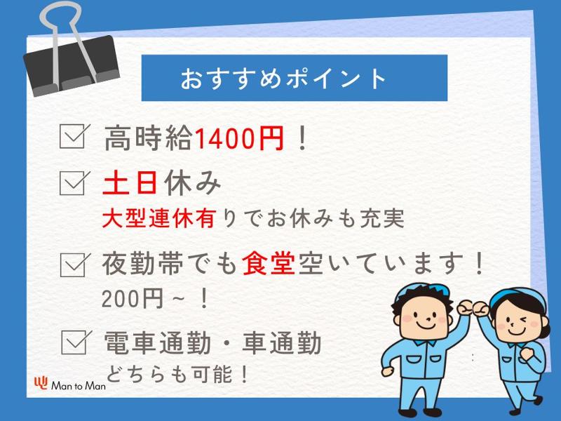 求める人材: 【応募資格】 未経験OK 特別な知識・スキルは一切不要です。 未経験からスタートした方が半数以上 Man to Manでは他にも以下の様なスタッフさんが活躍されています。 ・正社員を目指す方。 ・派遣社員としてスキルを磨きたい方。 ・主婦(主夫)の方。 ・アルバイト/パートからの転身の方。 ・短時間勤務からフルタイムに切り替えたい方。 ・工場でのお仕事に興味がある方 ・製造業や事務職にチャレンジしたい方。 ・フォークリフトの資格を活かしたい方。 ・学歴不問の職場で働きたい方。 ・介護をしながら働きたい方 仕事に対してこんなお悩みありませんか? ・男性・女性とも活躍できる職場で働きたい。 ・20代、30代、40代、50代活躍中の職場で働きたい。 ・交替勤務で働きたい。 ・土日休みの職場で働きたい。 ・交通費支給の職場で働きたい。 ・寮に住み込みで働きたい。 Man to Manには、 ハローワークや一般求人誌には掲載されていないお仕事情報もたくさんありますので、 まずはお気軽にお問合せください。