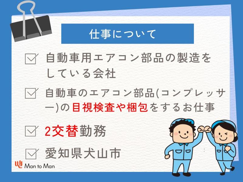アピールポイント: 【2交替】自動車のエアコン部品の検査/土日休み/未経験の方も活躍中!