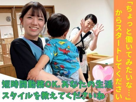 仕事内容 パート保育士 短時間OK/シフト相談可「ちょっと働いてみたいな」からスタートしてください 保育士パートの募集です。 職員の人柄を重視して採用していますので、良い方ばかりで安心して働いていただけます。 扶養内での勤務もOKです。 先生方の働きやすさ最優先なので、シフトや休日もできるだけ希望に沿ったものにさせていただきます! 未経験OK・経験不問、ブランクOKです!経験が浅くても大丈夫! もちろん、経験のある方、ベテランさんも即戦力としてご活躍いただけます。 ぜひ、あなたのご経験やスキルをお聞かせください! ・主婦・主夫の方、子育て世代の方も多数活躍中! ・U・Iターンの方、家族の転勤などで引っ越してきた、せっかくだから資格をいかして働きたいみたいな方に最適な仕事です。 保育の実務経験がなくても、子ども好きな方、子どもに関わる仕事につきたい方、ぜひご連絡ください。 ====================== 子育て世代に優しい職場です! ====================== ◆お子さんやご自身の体調不良はもちろん、学校行事の際も気兼ねなく休んでいただけます。 ◆子どもが好きな方、保育士資格を生かしたい方、経験は問いません。 未経験、ブランクも関係なく、子どもの気持ちを大切にしていただける方なら大歓迎です!! ◆先輩ママが多数活躍中なので、育児や家族に関する些細なことも気軽に相談できますよ! ぜひ、一度見学にいらしてください! 子育て世代に優しい職場です! ■柔軟にシフトを調整します! お子さんやご自身の急な体調不良はもちろん、 学校行事の際にも、気兼ねなく休めます! ■心強い味方に囲まれています! 先輩ママが多数活躍中! 育児や家族に関する些細なことも 気軽に相談できます! 沓掛けやき保育園の特徴は? 子どもも職員も楽しく! 個性を大事にのびのびと自分を出せる環境を大切にしています!」 職員が楽しいと子どもも楽しい♪ 楽しいの連鎖で子どもも職員も楽しくのびのびと過ごせています。 「子どもに関わる職員は人間的に良い人でなくては・・・ そんな思いで人柄を重視して採用しているのでみんな良い方ばかりです!」 だからこそ安心して働いていただけます。共に成長していきましょう! \「社会福祉法人真人舎」で検索/ 実際に働く職員の様子はYouTubeやInstagramで公開中! 転職前に知りたい、リアルな日常をぜひご覧ください! 【求人ID-EKY】