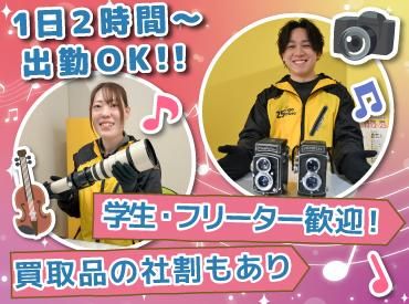 求めている人材 *買取経験・商品知識不問!未経験大歓迎! *学生さん歓迎!高校生さんもOK! *フリーター・Wワーク歓迎! *ブランクもOK!仕事復帰大歓迎! *子育て中の主婦(夫)さん活躍中! *短時間しか働けない方も大歓迎! *扶養内勤務OK! 【こんな方歓迎!】 ・音楽やカメラに興味がある方 ・元気な挨拶など明るい対応ができる方 ・コンビニやスーパー、アパレルなどでの接客経験をお持ちの方 *~19:00の夜の時間帯に勤務可能な方は特に歓迎!
