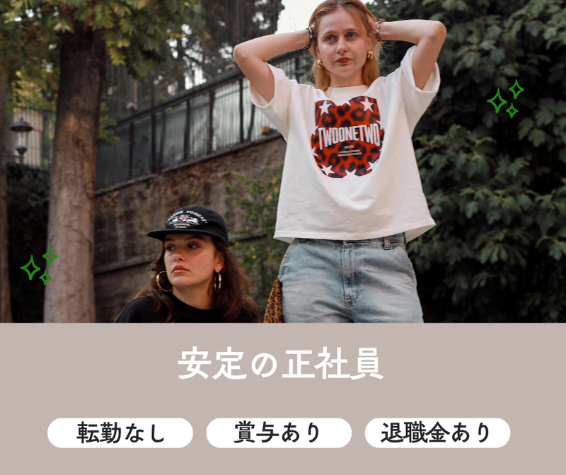 仕事内容 ✅安定雇用の正社員! ✅毎年昇給あり※1万円以上~ ✅賞与年2回(業績による) ✅インセンティブあり ✅退職金制度 ✅福利厚生が充実 ✅キャリアアップが目指せる ✅退職金制度あり ⭐アメリカンカジュアル 人気ブランドショップで働くお仕事 接客販売をメインに店長をサポートするお仕事です ◆◇◆具体的なお仕事◆◇◆ ・マネジメント 店舗運営が円滑に行えるよう、スタッフの管理を行います ・VMD ブランドのテーマに基づきお店をつくります ・接客販売 明るいご挨拶と適格なアプローチ、 お客様に寄り添った接客など スタッフへの指導をお願いします ・クライアント様対応 お取引先であるクライアント様へ売上のご報告や、店舗運営に関する連絡の対応 その他簡単なパソコン作業あり ◎チームで活躍できる わからない事、対応が必要な時など 1人で抱え込む事がありません! 店長や自社プロデューサーと連携して対応します ◎販売のスペシャリストに! 働くだけで自慢になるお店✨ 国内外から多くのお客様が来店されます ワンランク上の接客を体験できます ⭐地域限定社員 希望が無いかぎり転勤はありません ⭐長く働きたくなる昇給制度 毎年7月に1万円以上の昇給 ※2025年実績 1万円以上 68.7% 2万円以上 31.3% ⭐キャリアアップを目指せる 『自分の思い描く店舗づくりをしたい!』 →店長へチャレンジ 『店舗内マネジメントだけでなく、複数店舗の管理をしてみたい!』 →プロデューサーへチャレンジ 『ブランドともっとかかわりを持ちたい!』 →ブランドリーダーへチャレンジ