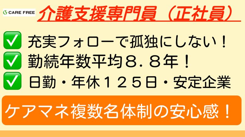 仕事の内容 ✅ 今の職場、1人体制でキツすぎ・・ ✅ 残業が少なくて、休みが多い職場がいいな ✅ 日勤だけで、働きたい! ✅ キャリアアップしたい! ✅ 仕事も家庭も大事! ✅ 手厚くフォローしてくれる職場がいいな ✅ 人間関係が良い職場で働きたい! ✅ 安定した会社で働きたい! ー もし、これらの中に、「1つでも該当するもの」があって、「今の職場を続けててもなぁ・・」と、悩まれていたとしても、ご安心ください。 おおげさかもしれませんが、「たくさんある求人の中から、このページにアクセスしたこと」が、あなたの「人生のターニングポイント」になるかもしれません。 ー はじめまして、こんにちは! ケアプランセンター友舞を運営する、株式会社ケアフリー代表の芝田 知明と申します。 たくさんある求人の中から、うちの求人を見つけていただき、ありがとうございます! それでは、「なぜ、このページとの出会いが、ターニングポイントになるのか?」について、1つ1つ、ご説明させていただきますね。 ちなみに、弊社は、「求職者さんにとって、とても大事な人生の選択だから、しっかりと情報開示する」といった考え方です。 一期一会の出会いを大切にしたいからこそ、「どんな事業所なのか」を、しっかりと求人に書かせていただいています。 こういった理由から、こちらの求人も長文になっておりますので、ひとまず、こちらのページを、お気に入り登録いただいた後、じっくりと求人をお読みいただければありがたいです。 ー 【フォローがすごい!ケアマネ複数名の圧倒的な安心感】 弊社には、2025年11月現在、5名のケアマネが在籍しています。 「ケアマネとしての専門性は高めたい」 「でも、ひとりで孤独に抱え込んだり、プライベートを犠牲にする働き方は、もうやめたい」 そう考えるあなたを、チームで歓迎できる環境を整えているんです。 ケアマネさんのお仕事は、基本的にはひとりで進めるもの。 でも、医療依存度の高いケースや、ご家族との調整が難航することもあると思います。 制度の狭間で頭を抱えたり、個人の知識や経験に限界を感じることだってありますよね。 そんな悩みや課題を共有して、できるだけフォローしたい。 こうした想いから、弊社は複数名体制にこだわっているんです。 弊社には、毎日の業務で「こんな時どうする?」って気軽に聞ける相手がいます。 難しいケースでも、チームの知恵があるからこそ、利用者さんに最適なプランを提案できます。 月末月初に集中するレセプト業務への対応も、複数名なら分担して効率化することができます。 「書類作業に追われて、利用者さんと向き合う時間が取れない」 こんな悩みも軽くなって、本来のお仕事に集中してもらえているんです。 経験が浅い方へのOJTも、ベテランの方がさらに活躍できる環境づくりも、チームだからこそ可能です。 でも、お仕事がスムーズなだけじゃなく、お休みもちゃんと取りたいですよね。 それも大丈夫。 風通しのいい職場なので、日頃からの情報共有で、チームメンバーの状況をちゃんと把握しているんです。 だから、お子さんの急な発熱みたいな突発的なお休みにも、「お互い様」の精神でしっかりフォローし合えます。 「やっとお休みが取れたのに、利用者さんにトラブルが発生して電話で調整対応・・」 「体調が悪いのに、ひとり体制だから無理して出勤・・いま自分になにかあったら利用者さんはどうなるの?」 弊社なら、あなたに上記のような辛い思いはさせません! アットホームな体制で、一緒に楽しくお仕事しませんか? ー 【同じ場所に、訪問介護事業所あり】 弊社は、「同一グループ・同じ場所」に、「訪問介護」と「ケアマネ事務所」があります。 共通のご利用者さんもいたりしますので、「困ったときはお互い様」の感じで、助けあっています。 情報共有や連携もスムーズなので、お仕事がしやすいと思います。 ー 【プライベート充実!でもキャリアアップOK】 今回の求人は、日勤のみで完全週休2日制、年間休日が125日となっています。 これは、ワークライフバランスを保ちながら、あなた自身のことを大切にした上で、利用者さんへ質の良いサービスを提供してほしいから。 弊社は基本的に、「プライベートが充実して、元気だからこそ良い仕事ができる」と考えています。 でも、「キャリアアップしたい!」というがんばりも、応援したいんです。 なので、キャリアアップ手当を支給しています。 特に弊社は、隣接している他の専門職員と関わる機会を持てますので、良い意味で刺激を受けたという方が多いです。 プライベートも仕事も大事に、あなたにフィットする働き方で、力を発揮していただければと思います! ー 【主な仕事内容】 ・介護に関する相談対応 ・ケアプラン(介護サービス計画書)の作成 ・ケアプランの修正、見直し ・介護サービス事業者との連絡、調整 ・サービス担当者会議の開催、運営 ・医療機関との連携 ・モニタリング(経過