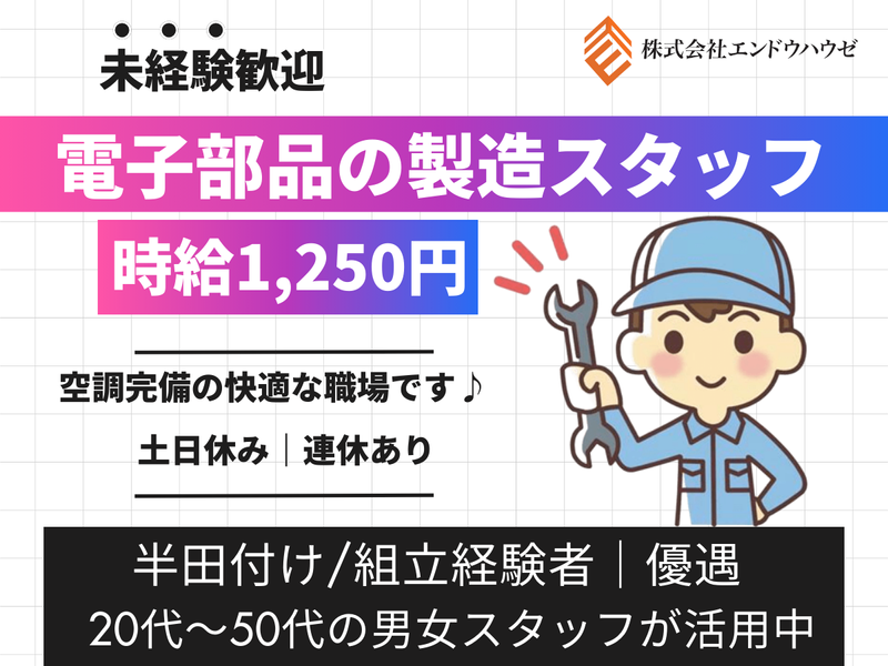 仕事内容 電子部品の製造スタッフの募集です! スキルや経験に応じて、下記いずれかの作業をお任せします 【具体的には・・】 ① 基盤への半田付け作業 ② SMTマシンのオペレーター作業 ③ 電動ドライバを使用した組立・測定作業 ※配属はスキルを見て決定します。 ・様々な製品に使用される電子部品の製造に関われます ・ 黙々と作業に取り組むのが好きな方におすすめです ★おすすめポイント★ ▶人気の日勤のみ&土日休み → プライベートも充実 ▶空調完備の快適職場 → 夏も冬も働きやすい ▶幅広い世代が活躍中(20代~50代) ▶職場見学OK! → 実際の雰囲気を確認してからスタートできる安心感 ▶未経験から挑戦できる電子部品製造のお仕事
