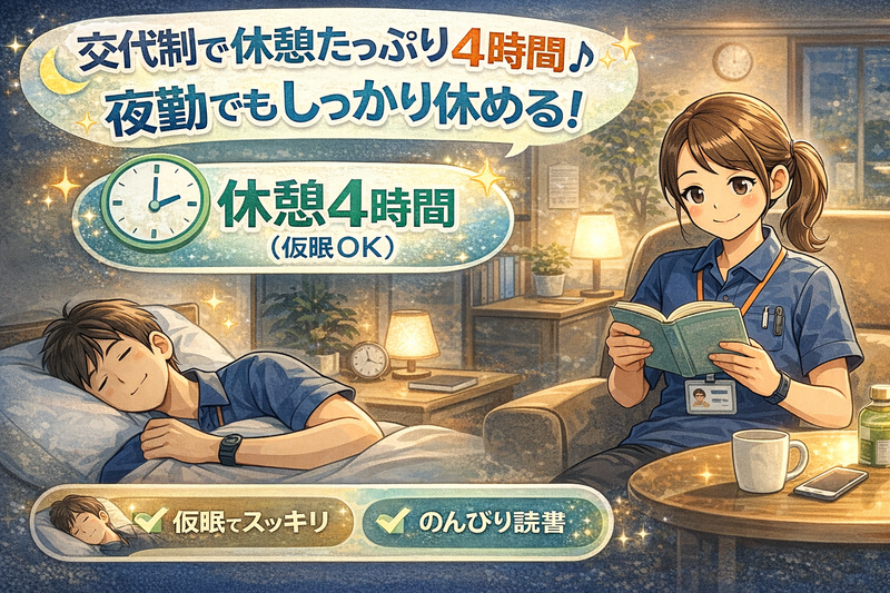 仕事内容 ✨**************✨ \ 夜間の見守りがメイン! / 落ち着いた時間帯で、 経験を活かして働ける夜勤専従のお仕事です ✨**************✨ サービス付き高齢者向け住宅にて、 夜間の見守り・生活サポート をお願いします。 【主なお仕事】 ✅ 夕食時の介助 ✅ トイレ介助 ✅ 夜間の見守り・巡回 ✅ 緊急時の対応 ✅ 日勤スタッフへの引き継ぎ・記録作業 ⭐ 医療行為はありません ⭐ 利用者さまが落ち着いて休まれる時間帯が中心です ⭐経験を活かして活躍できます ✨ブランクがある方も大歓迎 ✨「夜勤でしっかり稼ぎたい」 ✨「日中は別の仕事・家庭と両立したい」 そんな方にピッタリです。 ⭐休憩はたっぷり4時間! 夜勤でも しっかり休める環境 を整えています。 ⏬休憩時間の過ごし方は自由 ・食事をとる ・読書をする ・仮眠をとる 無理なく、落ち着いて働けるのが魅力です。 ⭐この求人のポイント ✨ 夜勤専従・日中の時間は自由 ✨ 見守り業務が中心で落ち着いた環境 ✨ 交代制で休憩4時間(仮眠OK) ✨ 週2日~OK/無理なく続けられる ✨ ミドル・シニア世代も多数活躍中