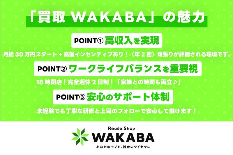 仕事内容 ✦・・・・・・・・・・・・✦ オープニングスタッフ 未経験でも高収入を目指せる環境 ✦・・・・・・・・・・・・✦ ◇今よりもっと稼ぎたい ◇家族やプライベート時間を大切にしたい ◇しっかりとしたサポート体制のもとで仕事したい 当店であなたのちょうど良いをかなえませんか? ー 〇仕事内容 ・お客様の接客対応 ・査定・買取提案(上司のサポート、マニュアルあり) ・簡単なパソコン作業 ・店内清掃業務 ー 実は…当社のスタッフほとんどが未経験スタートです。 工場、飲食、アパレルなど異業種出身のスタッフが多数。 研修やマニュアル、上司のサポートがあるので、 知識が無くても安心して始められます◎ <当店で働く3大メリット> メリット① 「高収入を実現」 月給30万円スタート+高額インセンティブ(年2回) 安定収入を得つつ、年収UPも目指せる環境です。 メリット② 「家庭時間とプライベートを大切にできる」 18時閉店でほぼ残業なし!完全週休2日制なので 家事時間やプライベート時間をしっかり確保できます◎ メリット③ 「未経験からでも安心スタート」 研修とマニュアルがしっかり整っているので安心。 わからないことはすぐに相談できる環境です。 未経験からでも無理なく働けます♪ ー 家庭やプライベートの時間を大切にしながら、 収入アップを目指しませんか?