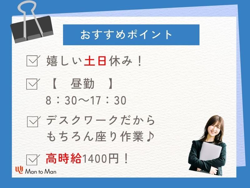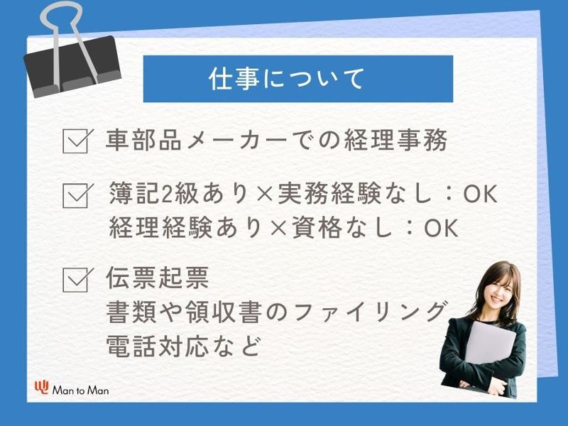 求める人材: 【応募資格】 ・必要資格:日商簿記2級 (実務経験なしの方も活躍中!) ・学歴:不問 派遣先には、未経験からスタートした方もたくさんいます! 【Man to Manでは他にも以下の様なスタッフさんが活躍されています】 ・事務のお仕事に興味がある方 ・学歴不問の職場で働きたい方。 ・春日井市、小牧市付近で働きたい方 Man to Manには、ハローワークや一般求人誌には掲載されていないお仕事情報もたくさんありますので、まずはお気軽にお問合せください。
