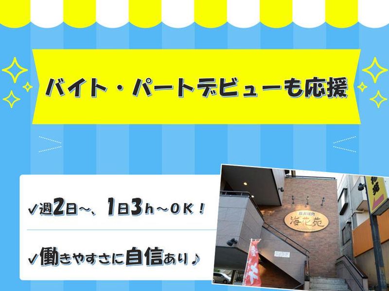 仕事内容 \ 短時間でお小遣い稼ぎしませんか / 出勤はランチorディナーの3時間だけ! スキマ時間で働けるから “無理せず続けやすい” とスタッフからも大好評なんです♪ 貴方にお任せしたいお仕事は お客様のご案内と料理の配膳のみ! 難しいお仕事は一切ないので バイト・パートデビューにも ピッタリな環境ですよ(*˘︶˘*)。・*✧ 店内は焼肉店とは思えないほど清潔で 広々とした空間なので地元の方から 長年愛され続けているんですよ♪ 常連さんも多いので お仕事に慣れてきたら 「今日も学校だったの?お疲れ様!」 「お子さん元気になった?よかった~」 なんてちょっとした雑談をしたり お客様とコミュニケーションをとるのも 仕事の楽しみになるかも…★ お仕事の流れやコツはイチから丁寧に 教えていきますので まずは安心して飛び込んで来てください♪ ゜+.――゜+.――゜+.――゜+.――゜+. \ 活躍中の先輩へインタビュー / ●家事と両立しながら働く主婦さん 今年の春から子どもが幼稚園に通い始めて 日中の空き時間が増えたので お小遣い稼ぎ程度に私も働こうかな って思って仕事探しを始めた時に 見つけたのが海花苑の求人でした。 11時~14時だけでOKだから 子どもが朝幼稚園に向かう時に ぐずったりしても全然間に合うし 帰ってから家族が揃うまでに 家事も済ませられるので いいお店を見つけたな~って感じてます! ●当店でバイトデビューした高校生 高1~今までガッツリ部活をやっていて 友達と遊ぶときは親にお小遣いを もらっていたけど、そんな部活も引退。 進路ももう決まってたから せっかくなら今からバイトを 始めてみようかなって思って よく家族で行ってた海花苑に応募しました。 行った事があるからメニューもすぐに 覚えることが出来たし、 接客は経験がなかったから 最初は先輩に助けてもらう事もあったけど 何回かシフトに入るうちに慣れて 今では1人である程度の事は 対応できるようになりました! 同い年の子や年の近い先輩もいて スタッフ同士で休みの日に 遊びに行くこともあったりと バイトを始めなきゃ出会えなかった人と 仲良くなることも出来て、 働き始めて良かった~!って思ってます!