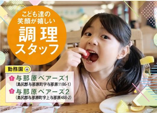仕事内容 \当法人直接採用/ こども達の「美味しい」が嬉しい 認可保育園の調理員パートさん ◆沖縄の子ども達の笑顔と元気!成長を育む認可保育園の調理スタッフとして活躍いてみませんか♪ ※複数名で作業分担して調理するので何かと安心♪ 【具体的には】 ☆園児(0歳~5歳)の昼食中心 ・昼食やおやつの仕込み ・献立に沿った調理全般 ・調理用具や食器類準備・洗浄 ◆20代・30代中・40代・50代! 幅広い年代の方々が活躍中! ✅男女不問!調理資格も不問! 調理や調理補助経験者は尚歓迎♪ ✅未経験の方も大歓迎♪ (親切指導で安心スタート) ☆1日4h~8h!週3日~応相談♪ ☆家事や育児と楽々両立OK♪ 【必要資格なし♪】 ☆調理資格は不問♪学歴不問! ☆調理や食べることが好きな方♪ ☆調理や調理補助経験者尚歓迎♪ ※保育園・学校・飲食店・社員食堂・旅館・ホテル・施設・病院・他 ☆主婦さん・フリーター活躍中 ☆お仕事復帰やブランクも歓迎! 【勤務園の詳細】 ■認可保育園/与那原ベアーズ1 沖縄県島尻郡与那原町与那原1186-1 交通/東陽バス【37. 那覇新開線】 「第二与那原」停下車歩4分 ★マイカー通勤OK(駐車場完備) ■認可保育園/与那原ベアーズ2 沖縄県島尻郡与那原町字上与那原488-2 交通/東陽バス【37. 那覇新開線】 「大里入口」停下車歩5分 ★マイカー通勤OK(駐車場完備) 【勤務時間・曜日】 7:30~16:30内で 1日4h~8h/時間応相談♪ ★月~土曜(祝休)内で 週3日~5日/シフト応相談♪ 【休日・休暇】 日曜・祝日・年末年始・慰霊の日 他、シフトはお気軽に応相談! <ゆとりある保育と美味しい昼食でこども達と充実した日々を> 小児科医の理事長が病気のお子様を診察する中で病児保育をやった方が良いと考え、保育園を立ち上げたところから尚徳福祉会が始まりました。 現在は保育・介護施設の運営を中心に複数展開をしており「良い保育園を作りたい」という想いを基に運営をしています。 【 残業管理を工夫 】 個人の働き易いスタイルに合わせて多めに採用を行っているので残業を減らせるようにしています。 また自宅へ持ち帰りやサービス残業は一切禁止なので残業時は1分単位で支給しています。 【ここもポイント】 ☆園見学も応相談/要事前予約(状況により実施出来ない場合もあります) 実際に働く現場(園内や厨房)を見られることで、就職前と就職後のギャップを感じることもなく安心して働き始めることができます。 ☆研修制度充実 未経験の方やブランクのある方にも親切丁寧な研修を用意しているので安心して働き始められます。 作業の流れや調理のやり方などしっかりサポートするので心配ありません。 ◆社会福祉法人で働くメリット 社会福祉法人とは、社会福祉事業を行うことを目的として設立される民間企業で、地域福祉の充実・発展という 「公共性」、利潤を目的としない「非営利性」、事業の持続という「安定性」を特徴としています。 ◆具体的な特徴としては 地域に密着して運営しているので異動があっても地元沖縄県与那原町内のスグ近隣。ご自身のプライベートにも大きな影響を与えません。 経営体系が利益追求型ではないので、業績による福利厚生の変動が少ない事も選ばれる理由の一つです。特に女性の場合は結婚・妊娠など、ライフプランの大きな転機があります。 企業によってはお仕事を辞めなければならないこともあり得ますが、社会福祉法人 尚徳福祉会は産休・育休取得率はほぼ100%!!職場復職を含め貴方が積み上げたキャリアを諦めずに働き続けられる環境を常にご用意しています。 <法人概要> 尚徳福祉会は平成8年に設立認可を受け、病児保育施設「病児看護センターベアーズデイサービス」及び認可保育園「保育園ベアーズ」(現認定こども園よなごベアーズ)を開設しました。 現在は沖縄(2園)、東京23区内(11園)、神奈川県内(8園)、鳥取県内(10施設)で介護老人保健施設、保育園、学事保育施設、病児保育施設を運営しています。 <運営理念> 私たち尚徳福祉会は、利用者を中心として関係するすべての人々の最善の利益を追求し、生活の向上をはかり、社会全体の福祉の向上に寄与することを基本理念としています。 施設運営にあたっては、利用者の皆さまを中心に考え、その上で周りのご家族や親族の皆さまのご意向もできる限り尊重するということを大切にしております。すべてのサービスはこの考えを元に提供しています。