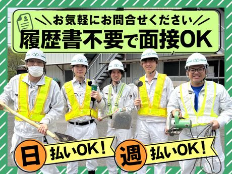 仕事内容 ///////////////////////////////////////// 電話応募大歓迎!ご質問のみもOKです 0120-59-8150(即面接・即採用もOK) ◆WEB・出張面接も可能です! ///////////////////////////////////////// <未経験や経歴に不安のある方も大歓迎> ・作業着・常用道具貸与あり! ・事前に準備する物は、一切ありません ・”とにかく”早く稼ぎたい方も、歓迎! ・短期や期間限定は1ヶ月~相談OK! ・日払いOK! ・中卒や10代、中高年(ミドル)やシニア活躍中! ・応募後、即面接、即採用も可能! 《今だけ!入社祝い金3万円支給》 ========= 【仕事内容】 <大手ゼネコンの現場で業務量は豊富で安定!> 建築現場での土木作業をメインにお願いします。 具体的には ・簡単な清掃 ・材料・道具の積み降ろし ・運搬 ・スコップを使用した土堀り ・ブロックの配置など 徐々にできるお仕事をお願いしていきます。 未経験や経験の浅い方も、 先輩の指示を受け「道具の名前や使い方」などの 簡単な作業から始められるので、ご安心ください! 困ったことがあれば、すぐに相談できる環境です。 《職場環境》 未経験スタート多数活躍中! 18歳~40代・50代・60代まで 若手から年配の方まで幅広く活躍中! 丁寧な研修でしっかり指導! 社内BBQ・フットサルなど 社内イベントも多数あり、 「やっぱり居心地が良い!」と出戻りのスタッフも多数います! 《様々な働き方が可能》 基本、残業はないのでプライベートとの両立もしやすい◎ ■週4日程度で無理なく働きたい方 ■週5・6日でしっかりと稼ぎたい方 ■住み込みで働きたい方 ■次の仕事までの繋ぎで短期で勤務したい方 など自分のライフスタイルに合った働き方が可能です。 《即勤務できて日払いもOK!》 作業着や道具の貸し出しがあるから、すぐに働けます! また、年2回のクオカード支給など、暖かい職場です! 《オフィシャルプレミアムパートナーとして湘南ベルマーレを応援!》 当社はサッカーチーム「湘南ベルマーレ」の オフィシャルプレミアムパートナーとして 地域を盛り上げる活動もしています。