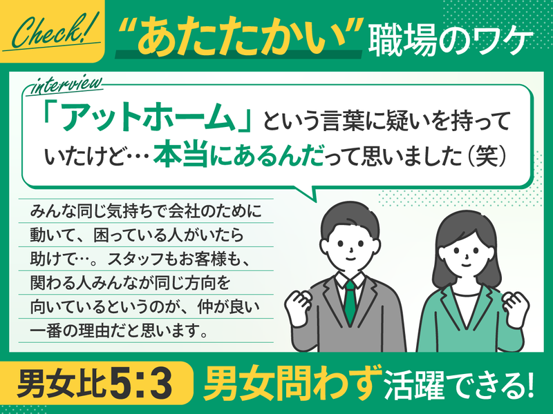 求めている人材 \\未経験者歓迎!扶養内勤務歓迎!// コミュニケーションスキルが活かせます! ・-・・-・・-・・-・・-・・-・・-・・-・・-・・-・ >> 女性スタッフ多数活躍中の職場 << ママさん多数!働きながら家事と両立も可能 ワークライフバランスもバッチリです! 【必須条件】 ・要普通自動車免許(AT限定可) ・高卒以上 ・基本的なPCスキル(メール・Excelなど) ※上記以外の資格不問・無資格歓迎 【歓迎条件】 ・販売、接客、営業など、人と接する仕事の 経験がある方 《こんな経験が活かせます!》 *接客・販売の経験 コンビニ・スーパー・ホームセンター ドラッグストア(薬局)・服屋(アパレル) 家電量販店・雑貨屋・花屋 など *カスタマーサポートの経験 コールセンター、コールスタッフ、 テレフォンオペレーター など *営業職の経験 提案営業、ルート営業(ルートセールス) 企画営業、個人営業、法人営業、不動産営業 テレアポ、テレフォンアポインター など *事務職の経験 一般事務、経理事務、宅建事務、不動産事務 総務事務、会計事務、財務事務、受付事務 など ※上記経験の雇用形態は問いません。 (正社員・アルバイト・パート・ 契約社員・派遣社員・委託社員・短期など) *主婦・主夫歓迎 *フリーター歓迎 *ブランクOK *業界未経験歓迎 *UIターン歓迎(U・Iターン歓迎) *宅地建物取引士の有資格者歓迎