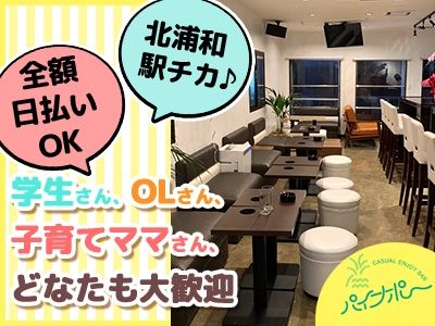 仕事内容 簡単なお酒を作ったり、お話を楽しんだり 初めての方にも簡単にできちゃうお仕事です。 ※高級住宅街が隣接する浦和エリアは 客層がとても良く安心して働けます♪ お酒は作っていただきますが、飲まなくてOKです! 飲めない方も、ソフトドリンクでカンパイしましょ♪ 【大好評♪1日体験入店(全額日払いOK)実施中】 《パイナポー》では、体験入店(時給1800円~)&おためしバイトを実施中! まずは応募の際に「体入希望」とお伝え下さい♪ ▼ 当日は、最初にスタッフが簡単な面接と、お仕事の流れを説明します。 履歴書不要!私服(パンツスタイルも可)でお仕事OK◎ ※年齢確認できるものだけお持ち下さい。 (免許証、パスポート、学生証、卒アルなど) ▼ 体験入店スタート 新人さんのことはスタッフがきちんと見守ります。 お客様も優しい方ばかりなので安心してくださいね! ▼ 体験入店終了 おつかれさまでした! お給料は全額日払いOK◎ 本入店するかどうかはゆっくり考えて決めてくださいね♪ ※体験入店は面接後となります。 ※応募者多数の場合や、当日の混雑具合によっては、 体入が出来ない場合もございます。ご了承ください。