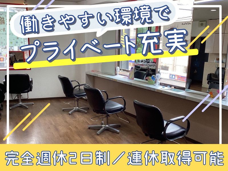 【保険制度】 雇用保険、労災保険、健康保険、厚生年金 待遇・福利厚生 【福利厚生】 ◆社会保険完備 ◆傷害保険有 ◆交通費全額支給 ◆資格取得支援 ⇒通信課程入学金5万円支給 ◆産休育休制度 ♦社割あり 家族:カット300円・カラー500円 友達:50%OFFでカット・カラー◎ ※営業中に施術してください♪