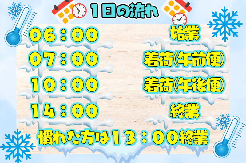 勤務時間・曜日: 勤務時間6:00~14:00(最短13時) ※上記時間は目安です 基本日曜日休みです ⭐️ 希望休み100%取得OK✨