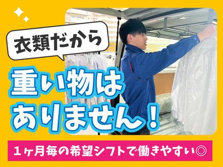 仕事内容 「配送の合間にサッとご飯済ませなきゃ…」 なんてことは一切なし!工場でゆっくり休憩◎ 扱うのは衣類だから重い物はありません 自社の大阪工場~周辺の自社店舗の往復で 距離が短く道を覚えやすい♪ ◆慣れるまで先輩スタッフの同行あり◎ ◆運ぶだけ!営業トークも不要!お客様対応ナシ◎ ◆運転していただくのは「ワンボックスカー」◎ ◆1店舗あたりの作業時間は3~4分で 1日10~12件程度を回ります◎ ◆配送件数ノルマなし◎ ◆大阪市内などの近距離配送 ◆一番遠い場所でも片道40分程度◎ 週5日のレギュラー勤務で収入も安定♪ 時給1200円でガッツリ稼ぎたい フリーターさんも大歓迎です♪ 【定着率高め!居心地◎】 現スタッフには10年以上勤務する方も! 黙々とこなせる仕事内容と、 働きやすい環境に居心地がイイ…♪と評判◎ 長く働いていただけます* お得で嬉しい♪クリーニング割引も◎ 職場環境について クリーニング品の配送・集荷! 未経験でも普通免許があればok☆ 現在、幅広い年齢の男女スタッフが 活躍しています。 接客などは一切ありませんので、 コツコツ黙々と仕事がしたい人歓迎です。 ノルマは一切なく、運転する車も ワンボックスでそう大きくありません。 未経験の方も安心してご応募下さい。 <勤務例> ▼クリーニング店を巡回 ▼お預かりした洋服を工場へ配送 ▼工場内で、少し作業のお手伝い (服の袋詰め/商品の伝票貼り等) ▼仕上がった商品を各店舗へ配送 ★距離も短く道を覚えるのもラクラク♪ 人と接することも少なく、 車内はあなた1人だから衛生面も安心です◎ お客様と話すことは一切ありません。 お昼休憩は工場内でゆったり! 余裕を持った配送スケジュールを組んでいるので、 午前の配送が終わったら必ず工場に戻ってきて、 お昼休憩を取ることが出来ます。 「車の中でササっとご飯済ませなきゃ」 なんてことは一切なし! ゆっくり休憩して、気持ちよく午後からの お仕事に取り組んでくださいね。 【職場の雰囲気がわかる動画も公開中!】 ※01