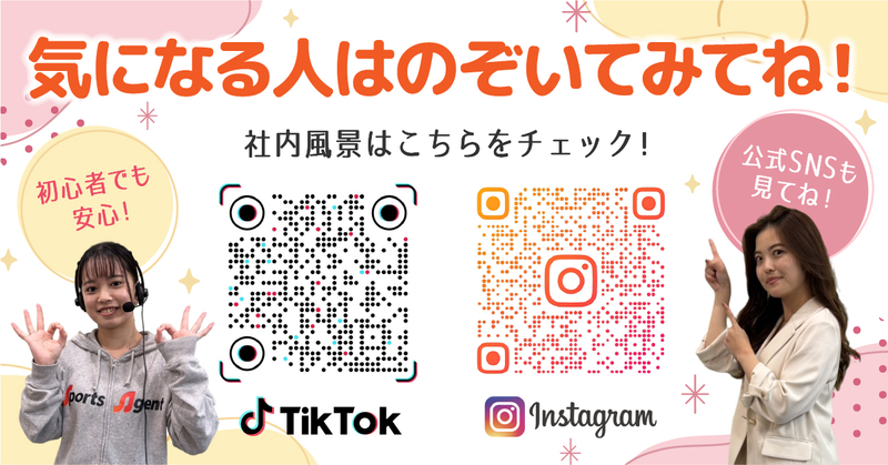 職場環境 \仕事も遊びも全力なSportsAgentです!/ 明るく元気なスタッフが多く、和気あいあいとした雰囲気の職場です。 未経験スタートのスタッフも多く、先輩スタッフが丁寧にフォローします✨ ネイルや髪色も比較的自由で、おしゃれも楽しみながら働けます。 喫煙所:なし(敷地内全て禁煙)