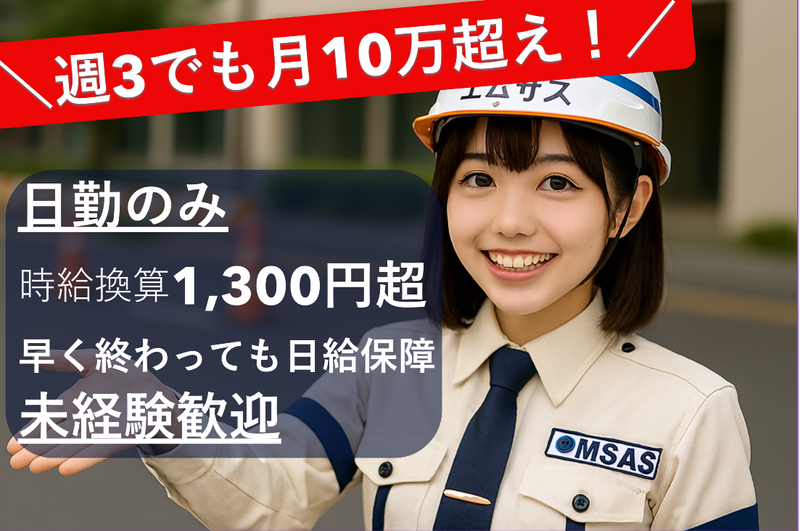 仕事内容 「週3勤務でも月10万円超え。早く終わっても日給保証。効率よく稼げる仕事です。」 ――未経験から始める“人を守るプロ”。仲間と一緒に、誇れる仕事を。 【仕事内容】 工事現場や店舗駐車場などで、歩行者や車両の安全を守る交通誘導業務です。 未経験でも安心してスタートできるよう、研修制度やサポート体制が充実。 現場はチームで対応するため、一人で抱え込むことはありません。 【働きやすさのポイント】 ・日勤のみで生活リズム安定 ・残業ほぼなしでプライベートも充実 ・週3日〜OK/Wワーク・フルタイムも歓迎 ・早く終わっても日給保証で安心 ・直行直帰OK/徒歩・自転車通勤もOK ・制服は汚れたら即交換。常に清潔な状態で勤務可能 【定着率80%の理由】 ・「警備士」という呼称に込めた誇りと敬意 ・未経験でも安心の研修環境 ・イベントで仲間との交流も活発 ・鉄道・高速道路など他社にはない現場も多数 ・安全を徹底する“安全オタク集団”だからこそ、仕事に深みと面白さがある 【こんな方におすすめ】 ・未経験から新しい仕事に挑戦したい方 ・効率よく稼ぎたい方 ・仲間と支え合える職場で働きたい方 ・Wワークやフリーターからステップアップしたい方 ・社会に貢献しながら、自分らしく働きたい方