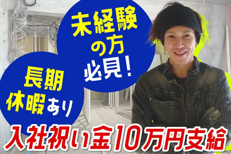 【アピールポイント】 【内装業の現場スタッフ募集中!】 マンションやビルの壁に「⽯膏ボード」を貼るお仕事 ✅未経験からしっかり稼げる!学歴/経歴不問 ✅髪型・髪色、ひげもOKの自由な職場 ✅入社祝い金あり!