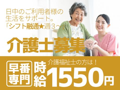 勤務時間 派遣先のシフト表に準ずる <具体的な勤務時間> ■7:00~16:00 ■8:45~17:45 ※実働8時間、休憩1時間 ※週3日勤務よりご相談ください ※残業ほぼなし <お仕事の1日のスケジュール例> ※標準的なスケジュール 07:00~ モーニングケア、朝食配膳、誘導 09:00~ 入浴介助 10:00~ 体操、フロア対応、お茶の提供など 11:30~ 昼食配膳、誘導 13:00~ 入浴介助、フロア対応 14:00~ レクリエーション実施、コール対応 15:00~ おやつのご提供 ~16:00