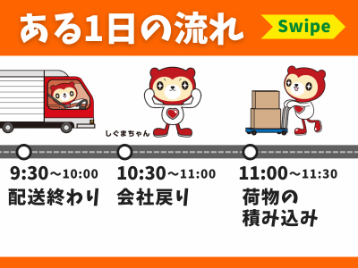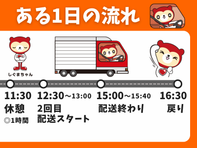 仕事内容 ■おすすめポイント■━━━━━━━■ ・週4日で月収34.5万円可◎ ・完全シフト制/週休3日 ・コンビニ配送の日勤or夜勤のお仕事 ・運転しやすい3tトラック ・交通費全額支給◎ガソリン代も! ・来社不要★簡単面談で即登録OK ・40代・50代半ばスタッフ活躍中! ■━━━━━━━━━━━━━━━━■ 3tトラックを使用し、コンビニへの 食品ルート配送(フローズン)を お任せします。 アイスコーヒーやレジ周辺の 食品等の配送です◎ 【お仕事の流れ】 配送先の確認 ▽ 商品の積み込み ▽ 配送先へ出発 ▽ 商品の納入・空ケースの回収 ◎台車使用で身体の負担少なめ ▽ 1日分が終われば帰社 ▽ 回収したケースの片付け 翌日の準備 ▽ 退勤ーお疲れ様でした◎ ・店舗数:2回転で10-14店舗 ・配送のみで商品陳列ナシ ◆とにかく稼ぎたいなら夜勤  ̄ ̄ ̄ ̄ ̄ ̄ ̄ ̄ ̄ ̄ ̄ ̄ ̄ 残業あり・深夜割増手当あり! 週4で月収34.5万円も可能! 「朝はちょっと苦手」 「配送はやっぱり夜がいい!」 という方にぴったりです◎ 【1日のタイムスケジュールの一例】 (16時勤務の場合の例) 16:00 出勤 荷物の積荷 16:40 朝礼 注意事項等共有 16:45 配達スタート 17:40 一件目到着 20:30-21:00 配送終わり 21:30-22:00 会社戻り 22:00-22:30 荷物の積み込み 22:30-23:30 休憩 23:30-00:00 2回目配送スタート 02:00-02:40 配送終わり 03:00-03:30 戻り