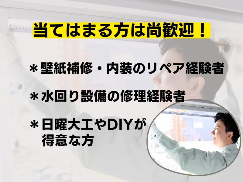 求めている人材 年齢不問 <以下のいずれかに当てはまる方尚歓迎> ・壁紙など内装のリペア経験がある方 ・水回り設備の修理経験がある方 ・手先の器用さに自信がある方 ・日曜大工やDIYが得意 ・電気工事士資格者 ・ボイラー技士資格者