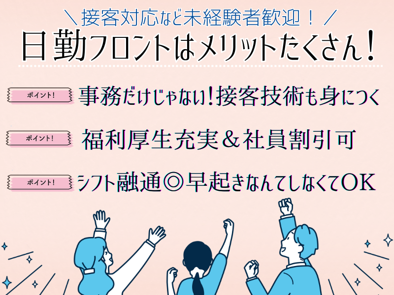 求めている人材 ▶未経験者歓迎!  ̄ ̄ ̄ ̄ ̄ ̄ ̄ ̄ ̄ ̄ ̄ ̄ ̄ ̄ ̄ ̄ ̄ ̄ ̄ ̄ ・高卒以上 ・基本的なPC操作ができる方 ・副業・WワークOK (週40時間以上働いている方のWワーク不可) ・フリーターさん・主婦(夫)さん活躍中 ・扶養内勤務もOK ・学生さんも歓迎 ・20代~40代の女性スタッフ活躍中! ▶経験よりも人柄採用!  ̄ ̄ ̄ ̄ ̄ ̄ ̄ ̄ ̄ ̄ ̄ ̄ ̄ ̄ ̄ ̄ ̄ ̄ ̄ ̄ あなたのちょっとした気遣いや思いやりが 私達ホテルの最高のおもてなしとなります♪ 「家事と両立して無理なく働く主婦」 「フルタイムで ガッツリ稼ぐフリーターの方」 「別の仕事の前に働くWワークの方」 など、20代・30代・40代まで活躍中! ▶こんな方におすすめ!  ̄ ̄ ̄ ̄ ̄ ̄ ̄ ̄ ̄ ̄ ̄ ̄ ̄ ̄ ̄ ̄ ̄ ̄ ̄ ̄ ✔ 接客にチャレンジしたい ✔ 昼間だけ働きたい主婦の方 ✔ 安定して働きたいフリーターさん ✔ 人と話すのが好き ✔ 未経験から成長したい