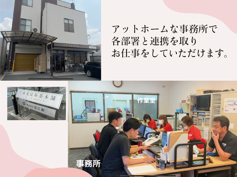 仕事内容 \ 4月から勤務できる方歓迎! / ✨今年で創業67年を迎える安定企業◎ ✨PCの基本的な操作ができる方 ✨子育て落ち着き世代の仕事復帰にも! ―――*―――*―――*―――*――― 【 仕事内容 】 地元に根ざした昆布茶メーカーでの 一般事務全般をお任せします! ・各種書類の作成(WordやExcelを使用) ・伝票整理 ・お取引先からの請求書確認 ・電話応対 ・PCでのデータ入力 ・その他付随する事務作業 など PCでの作業がほとんどなので、 PC操作に抵抗がない方は大歓迎。 自信がないという方も、 やる気重視で丁寧に教えます! 初めはサポート的な業務からスタート◎ 未経験の方もブランクがある方も安心! 先輩が優しくフォローします♪ 子供も大きくなってきたし、 ブランクがあるけど働きたい… 事務の経験を生かして社会復帰したい… そんな方もぜひご応募ください♪ ―――*―――*―――*―――*――― < 当社について > 1958年の創業以来、八尾を基盤とし、 素材と安全面にこだわり続けた昆布茶メーカー。 厳選した国産原料を使用し、色・味・香りの バランスにこだわった昆布茶を創り続けてきました。 その経験と技術で、現在は昆布茶だけでなく 色々な商品づくりに挑戦しています。 地元に根づいた安定企業で、 じっくり腰を据えて働きたい方は大歓迎! ぜひご応募お待ちしております♪