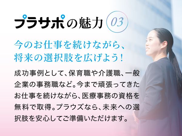 仕事内容 ・受付、会計、電話応対 ・レセプト業務 ・検査補助 ・入力業務(定型フォーマット) など <求人のポイント> 敦賀市内の眼科クリニックで受付業務をお願いします。 その他に検査補助や会計業務などもありますよ。 PC操作は入力ができれば問題ありません。 医療機関での就業経験がない方もご応募可能です◎ 人と接することが好きな方やコミュニケーションが得意な方にもピッタリですよ。 平日に1日しっかりお休みがあるのもうれしいですよね♪ 時間帯はシフト制で勤務していただきます。 まずはお気軽にお問い合わせください。 <プラウズからのひとこと> *資格も経験も「プラサポ」で! ご希望者には私たちプラウズが提供する資格取得サポート「プラサポ」で、 お仕事をしながら、資格取得のための通信講座を「無料※」で受けられます! 無資格・未経験からでも医療事務や調剤事務、医師事務作業補助者など、 医療の現場で活躍するためのスキルと経験を同時に手に入れることができます。 興味のある方はぜひお気軽にお問合せください。(※当社規定あり)