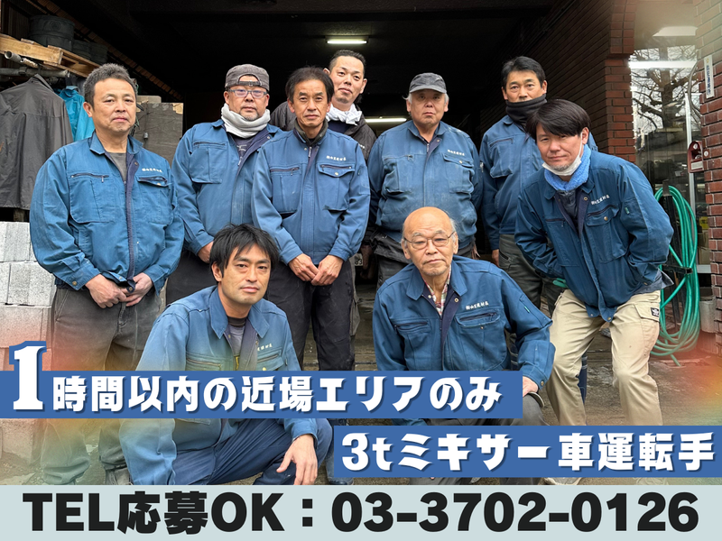 仕事内容 ◤ ̄ ̄ ̄ ̄ ̄ ̄ ̄ ̄ ̄ ̄ ̄ ̄ ̄ ̄ ̄ ̄ ̄ ̄ ✨片道1時間以内の近場のみ✨ 業績好調!事業拡大の為スタッフ大募集! 残業ほぼ無しでプライベートも充実⭐ 簡単レバー操作なので、力仕事なし 長距離や夜間の走行もなく、 ドライバー未経験者も活躍できます♪ 少しでも気になった方は電話応募もOK TEL:03-3702-0126 __________________◢ 3tミキサー車運転手を大募集!! 【仕事内容】 力仕事に自信がなくてもOK✨ 生コンクリートを工場から現場へ お届けするお仕事です。 遠方への配送がないため、 安心して働けるのが魅力の一つです♪ 積み込みや積み下ろしは レバー操作で行うため、 力仕事に自信がない方でも大丈夫です✨ ================= <1日の流れ> 工場で生コンクリートを積んで、 現場にお届けします。 その後、再び工場に戻り積み込み 次の配送先へ向かいます。 1日に約4件の配送を行い、 目黒区内を中心に1時間圏内の エリアをカバーしますので、 長距離移動はありません。 事務所に戻ったら、 洗車をして業務終了となります! =================