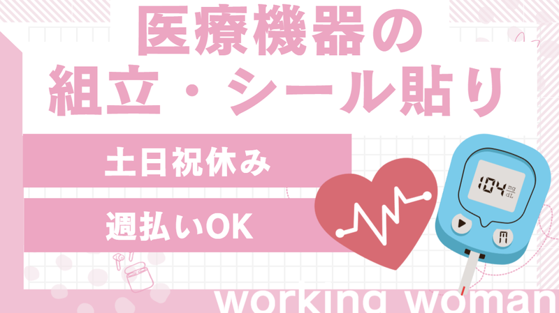 仕事内容 医療機器の組立・シール貼り ▼組立・シール貼り作業スタッフのポイント▼ ・長期で働けます ・土日祝休み ・日勤のみ ・この時期必須!暖房・冷房完備! ・交通費支給 < 詳しい仕事内容 > 簡単な組み立てと出来上がった商品の シール貼りです。 全て軽作業なので経験がなくても活躍できます。 < 未経験スタートOK > 特別な経験・資格は必要ありませんので 安心してご連絡ください! ほとんどの方が未経験からスタートしております < こんな経験がある方は大歓迎! > 製造業関連の経験があれば活かせます! ・組立での工場勤務 ・組立での金属加工 雇用形態は 派遣でもパート・アルバイトでもOK < 幅広い年代の方が活躍中! > 若年層・20代・30代・40代。50代などの 幅広い年代の女性が活躍しております。 < 空調完備のきれいな職場 > 暖房や冷房等の空調も完備されてますので、 年間を通して快適な環境です。 < 職場見学あり > 詳細な仕事内容は職場見学にてご説明いたします。 不明点や不安点などは 職場見学を通して確認してみてください!